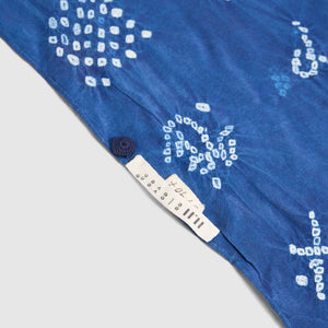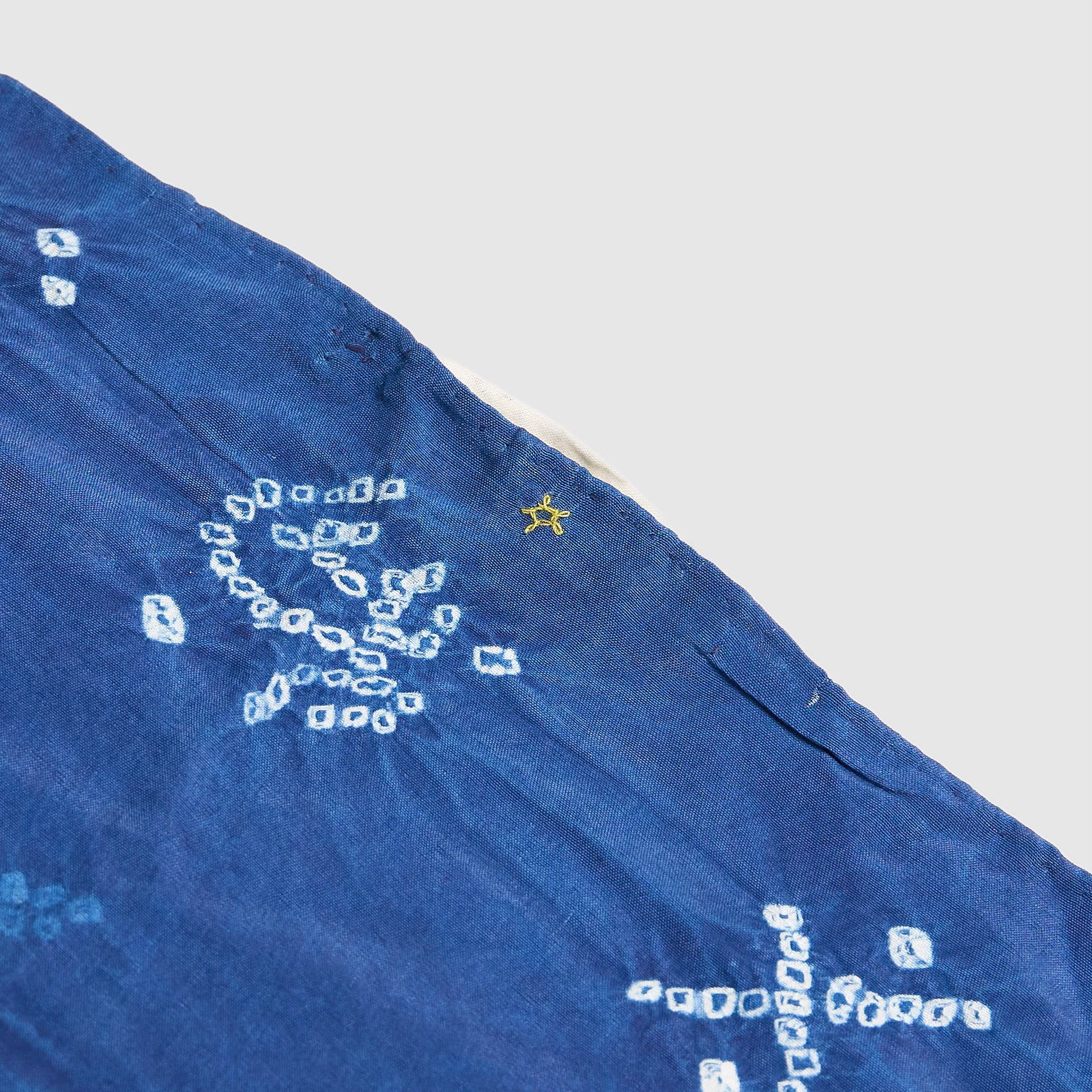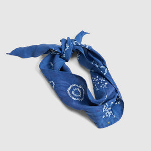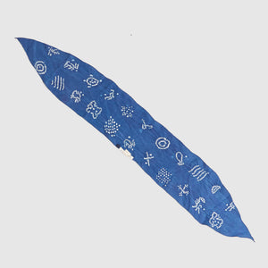 Crafted with care by skilled hands, this bandana carries the quiet energy of traditional dyeing techniques. The light and dark indigo hues come from natural dyes sourced from India's landscape—each fold and fade telling a story of slow, intentional making. The patterns are created by hand, tying small beads into the fabric before dyeing—each one set by hand. Here the patterns represent native symbols. Lightweight yet substantial, it elevates the everyday—draped over a jacket collar, tied to a bag strap, or simply tucked into a pocket as a reminder of thoughtful craftsmanship.