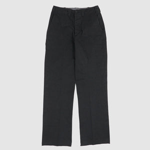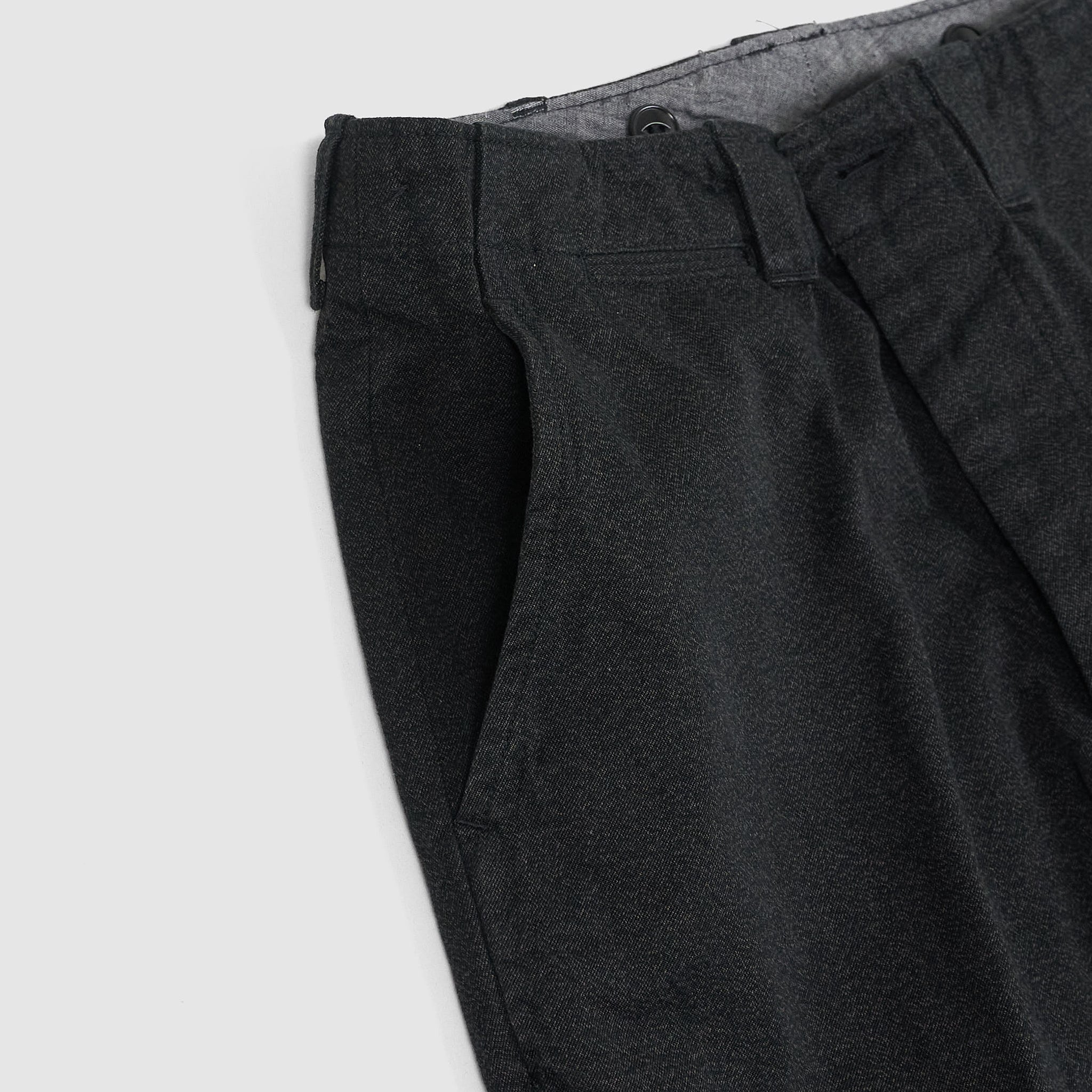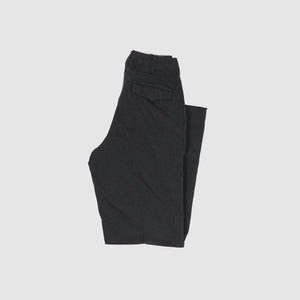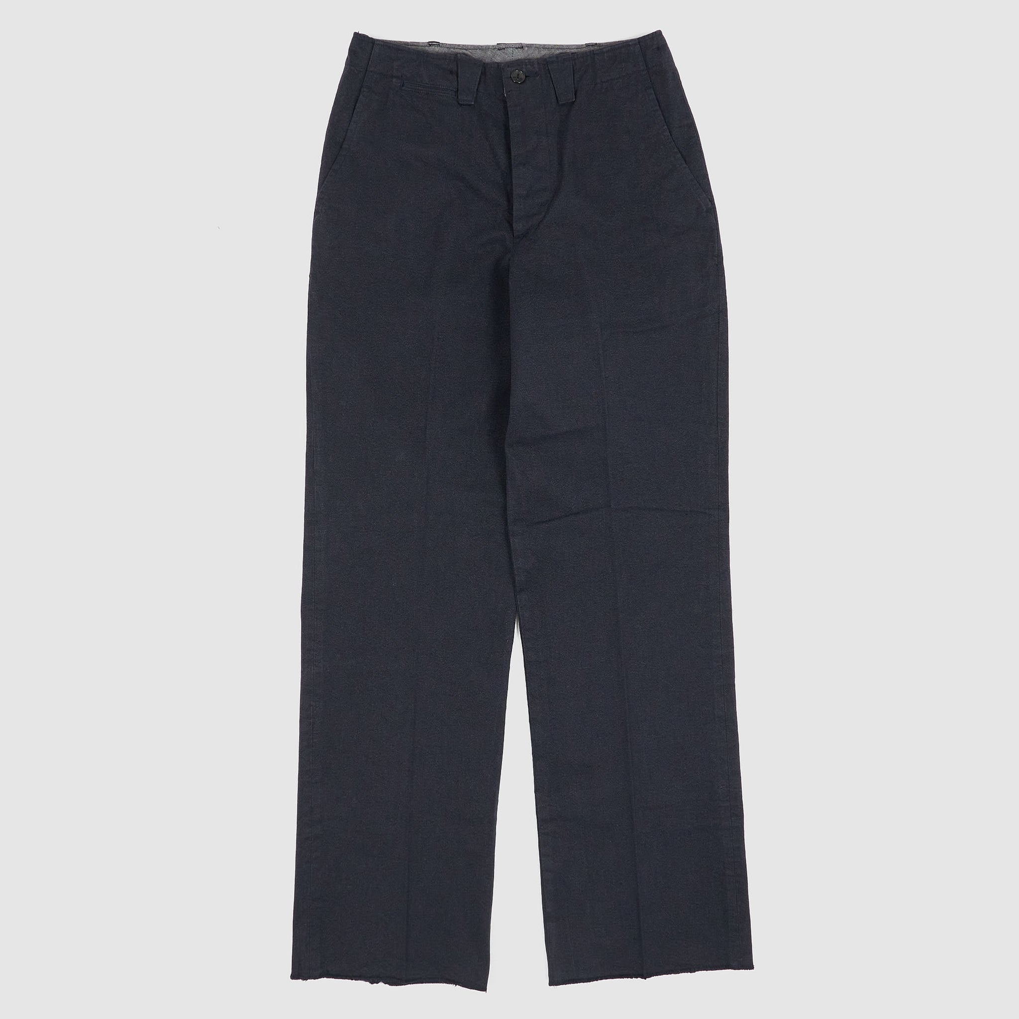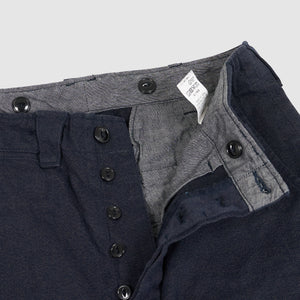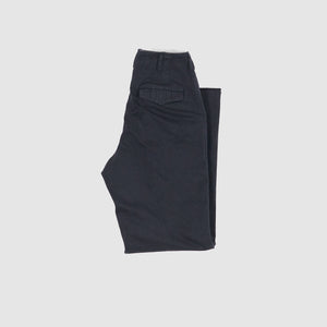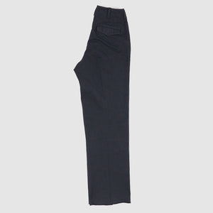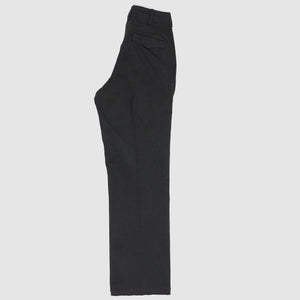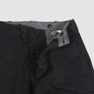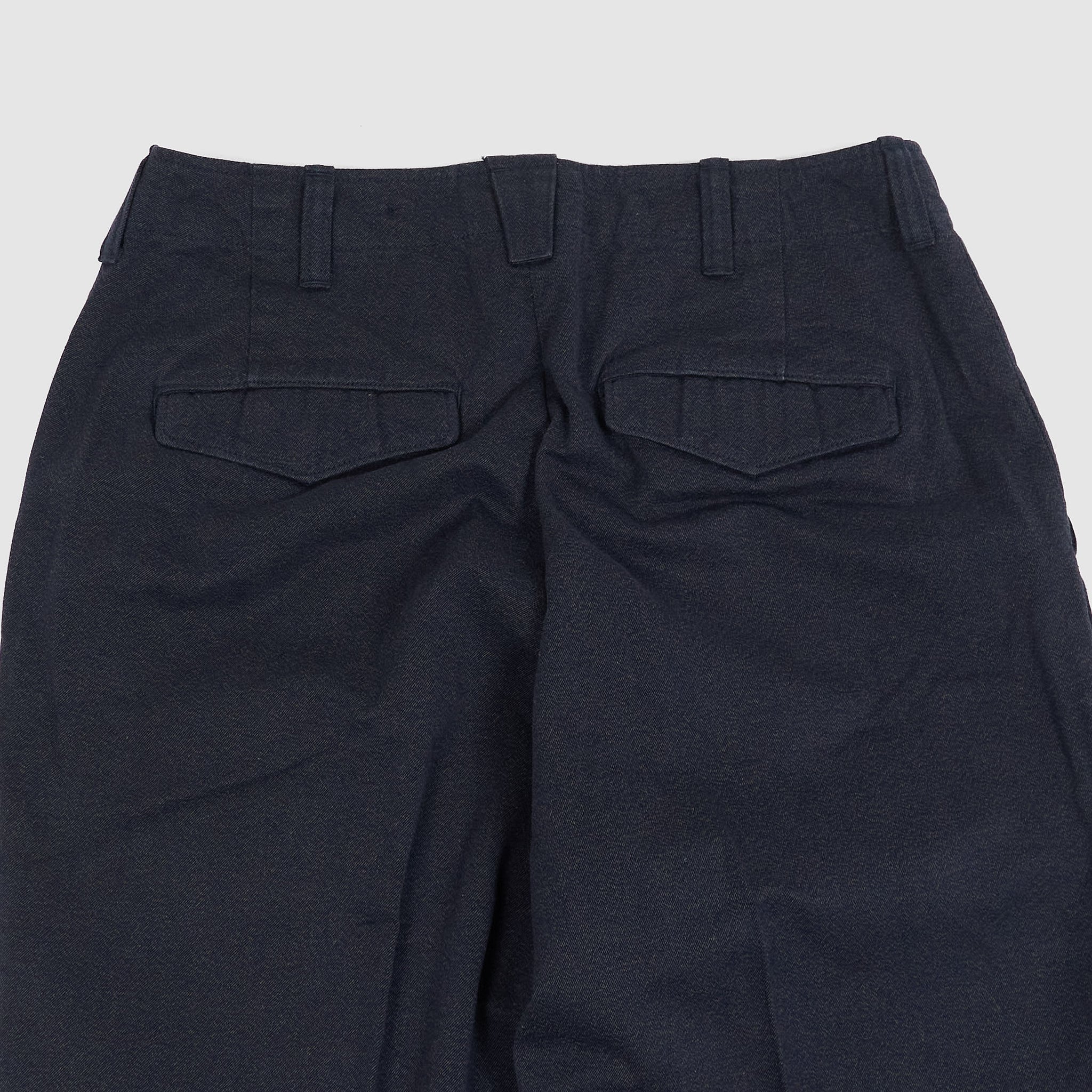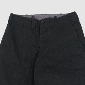 Based on 1940s US military officer trousers, these pants are crafted from a high-density cotton twill woven with mock twist yarn for subtle texture and all-season versatility. Designed with military-inspired details like varied belt loop shapes for functional use and back pocket flaps that can be tucked in for a clean look. Lined in black chambray at the pockets and waistband and finished with urea cat-eye buttons, they offer a refined, vintage-informed silhouette with contemporary wearability.