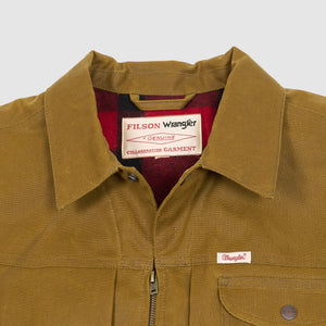 Built for rugged outdoor work and Western heritage, this collaboration jacket is constructed from Filson's legendary 14-oz Tin Cloth waxed cotton—twice the weight of typical imitations. The body is lined with warm Mackinaw Wool while the sleeves feature polyester insulation for easy layering. Designed with angled welted hand pockets, a snap-flap chest pocket, zip-front closure, and adjustable hem tabs.