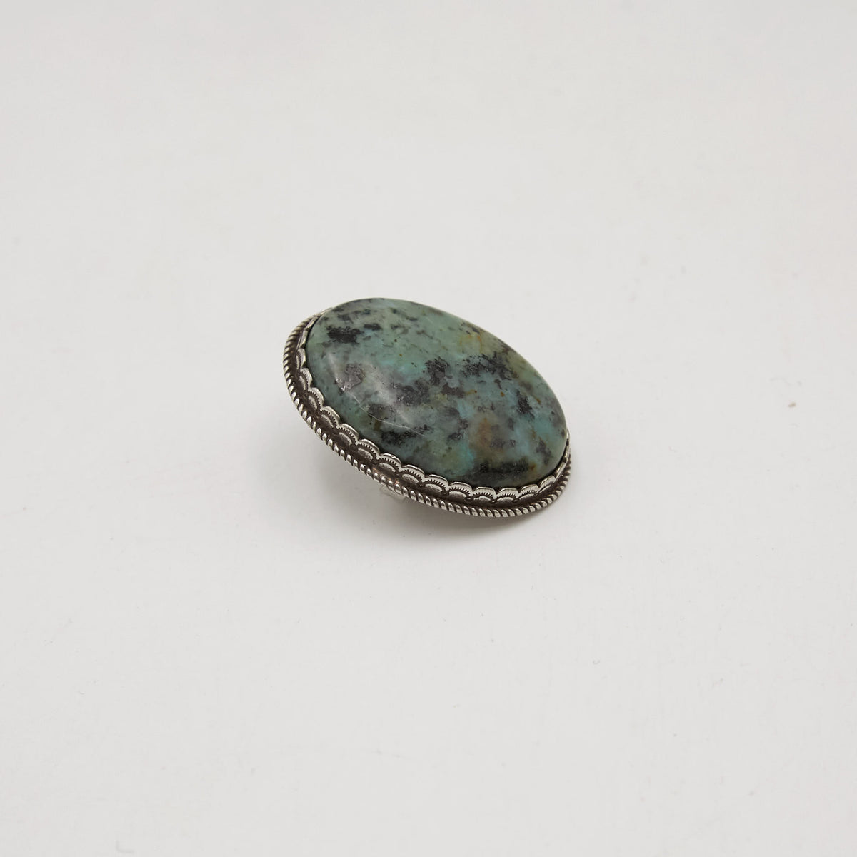 Centered with a vibrant turquoise cabochon, this ring features a brass setting in a vintage silver finish. The scalloped edge and stamped motif add rustic charm, while the Double RL Ranch logo on the back underscores its Western heritage.