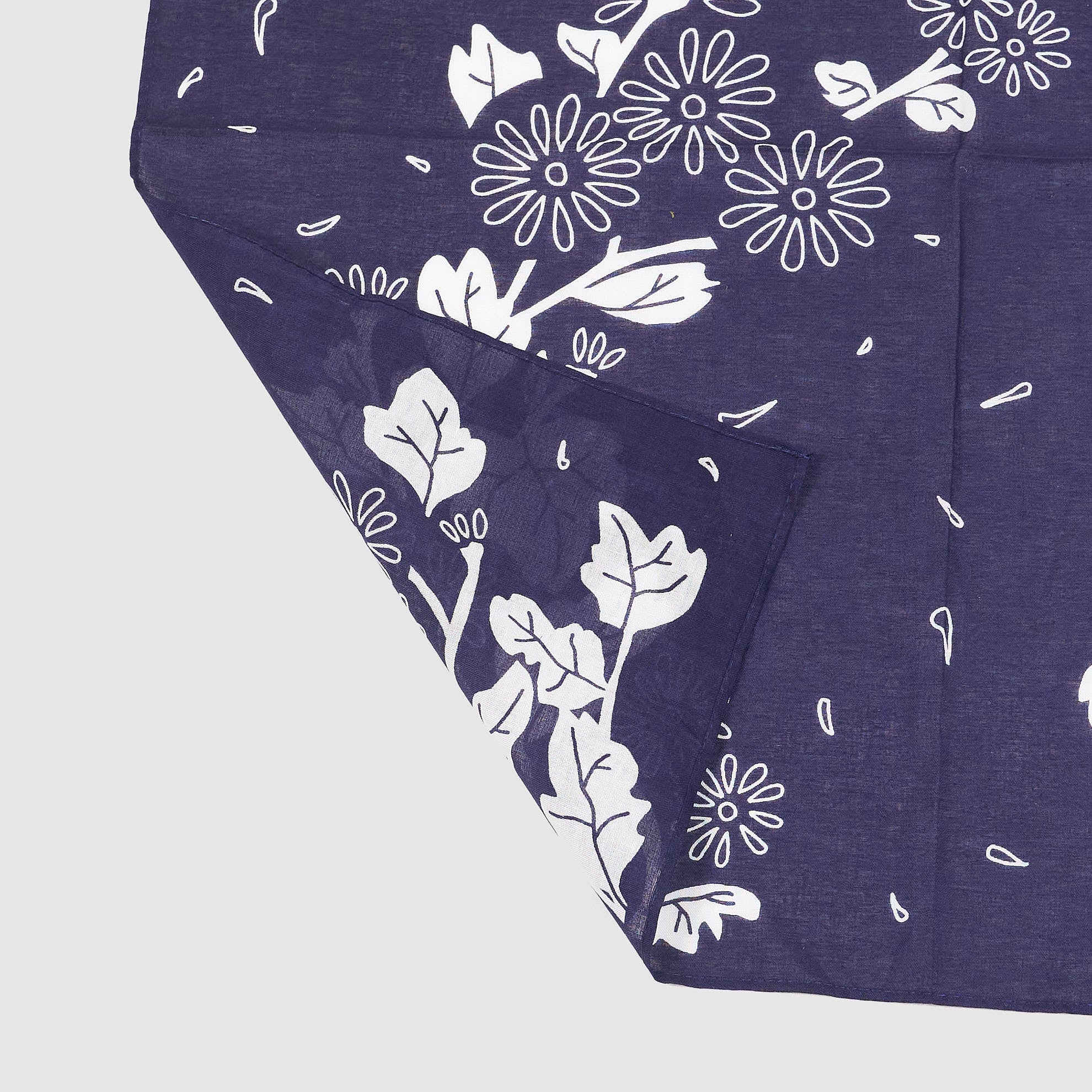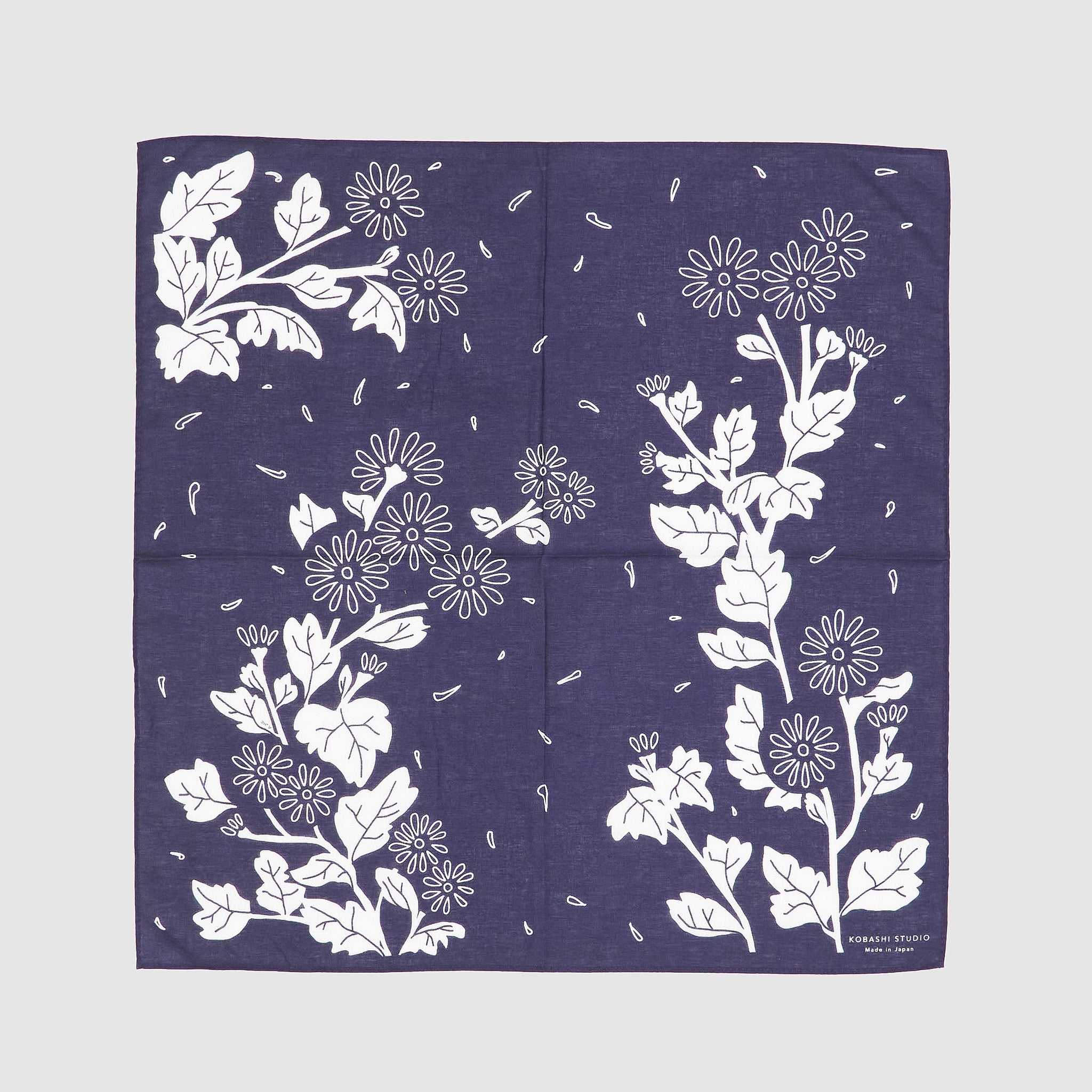 A tribute to samurai-era symbolism, this bandana showcases the iconic Kikumon (chrysanthemum crest) in Katsu-iro—a deep victory navy historically worn by warriors. Hand-illustrated by founder Junichi Kobashi and silk-screened by a Tokyo atelier founded in 1918, the dye penetrates fully for reversible richness. The 16-petal chrysanthemum symbolizes imperial honor, while Katsu-iro was believed to channel.