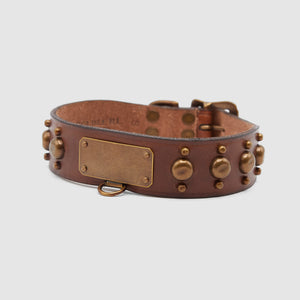 Crafted from vegetable-tanned leather polished to a rich vintage patina, this dog lead combines rustic charm with functional elegance. Unlacquered brass hardware—including an adjustable buckle, D-ring, and personalized nameplate—develops a natural used finish over time, while the suede lining adds understated luxury.