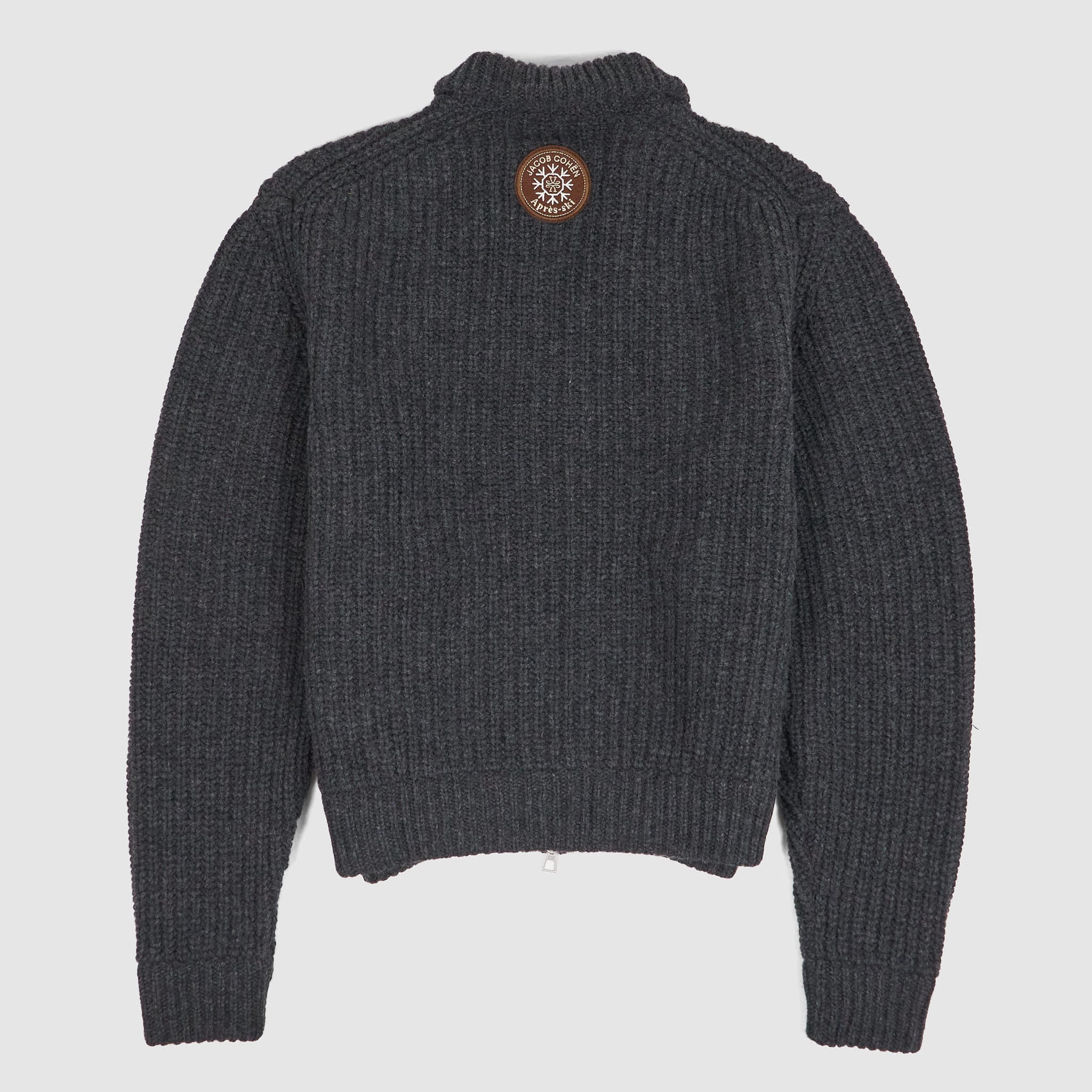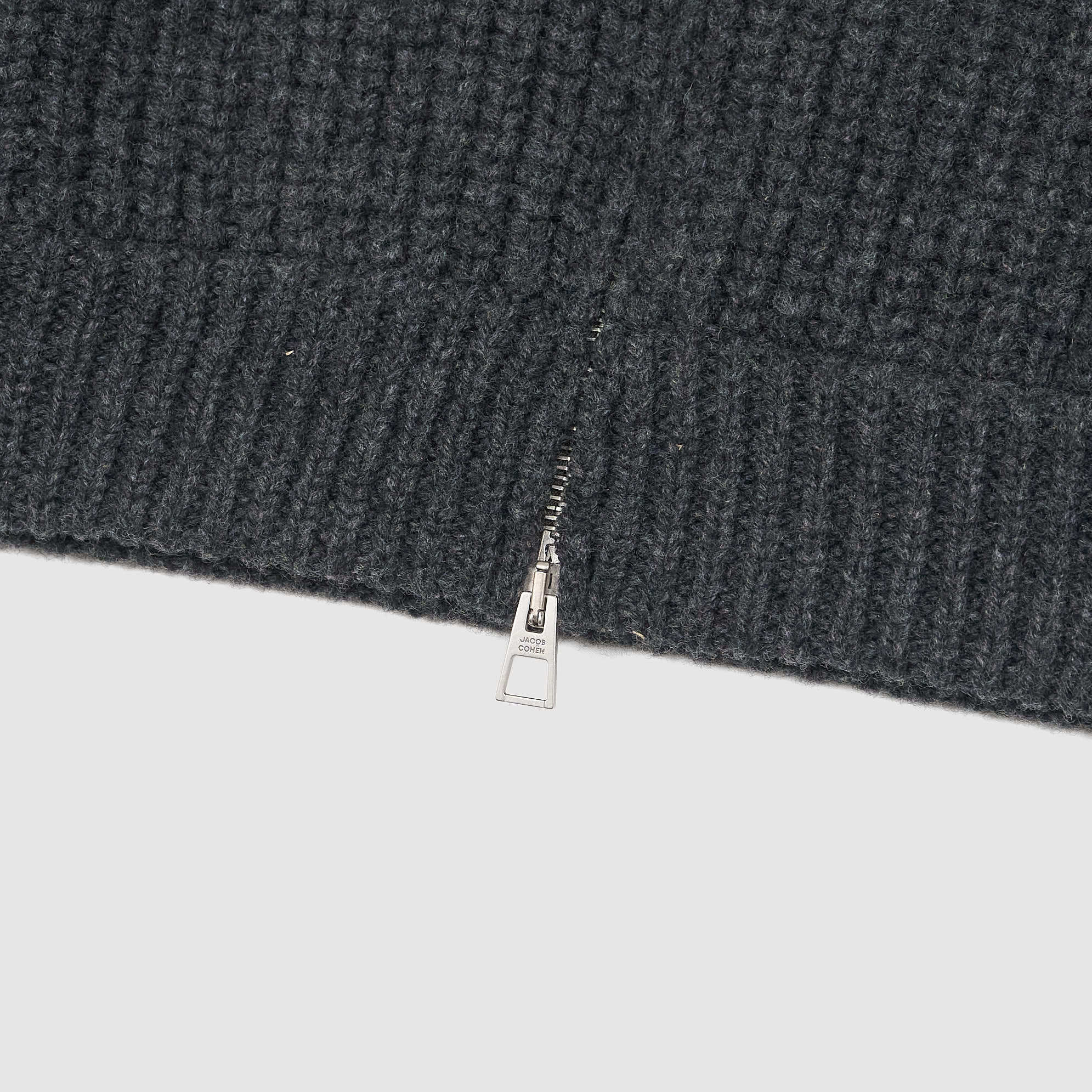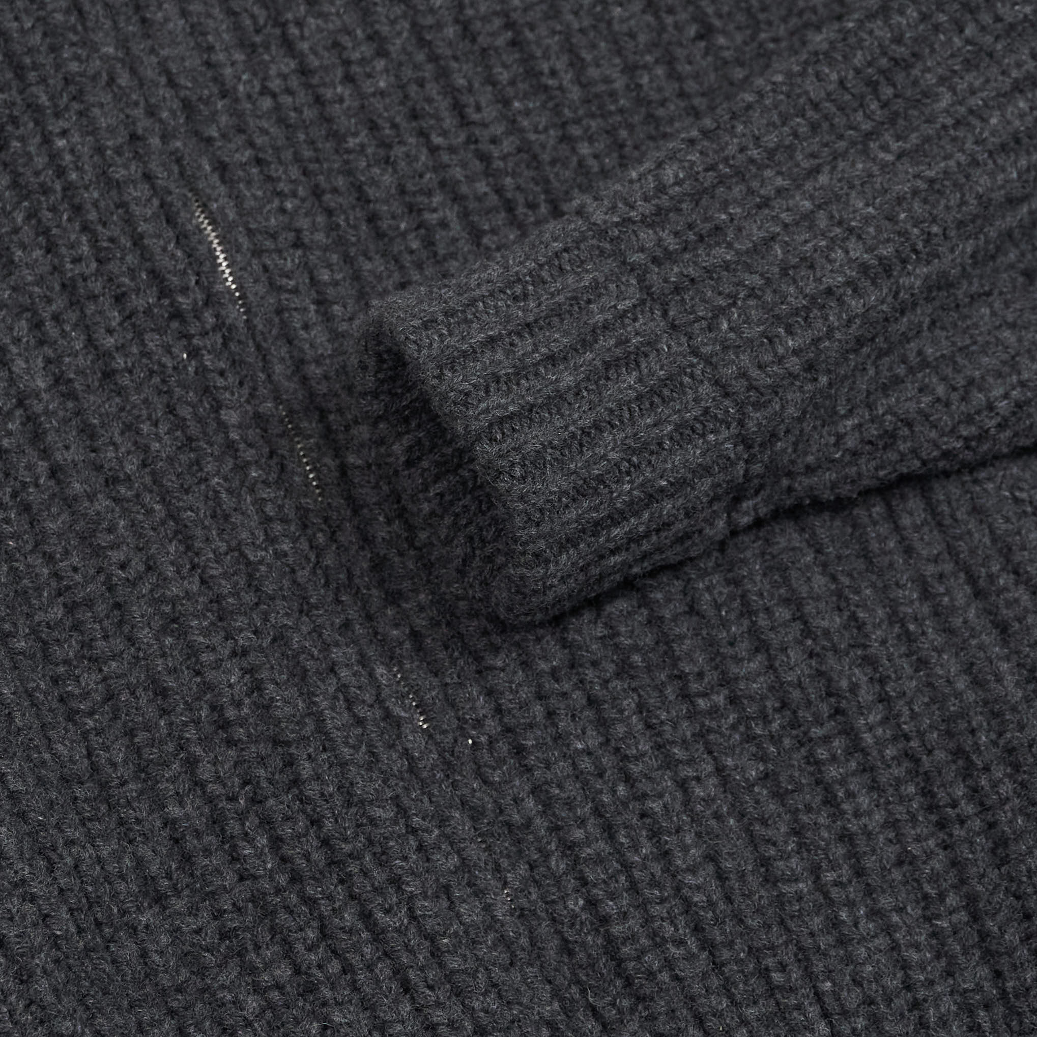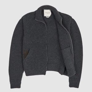 A knitted zip cardigan crafted from dark grey melange pure wool in a substantial gauge 3 bobble stitch. Featuring a full zip closure with branded puller, front pockets with coin pocket, and a discreet logo patch on the back.