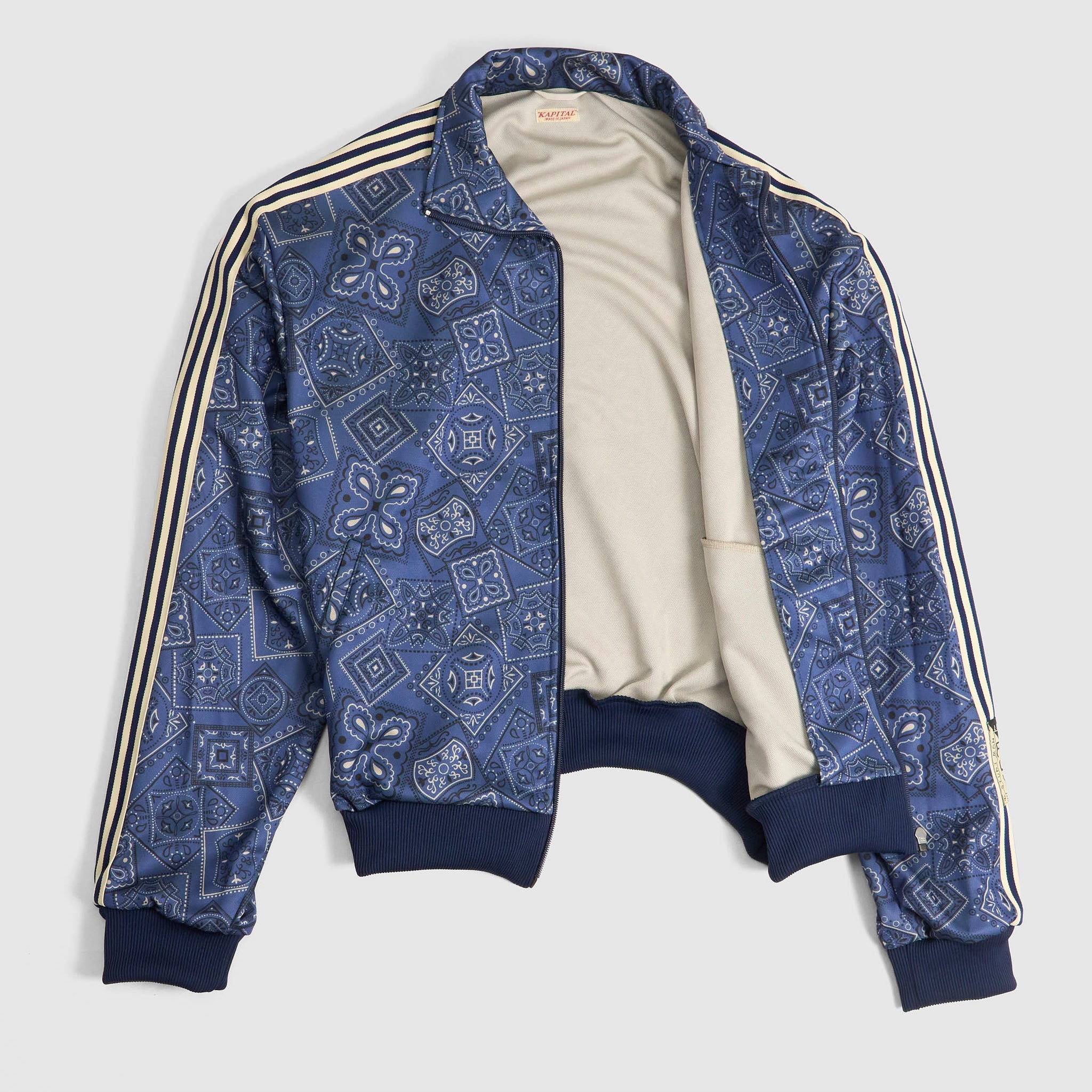 Fans will instantly recognize the playful 'cookie' mascot printed across this KAPITAL track jacket—inspired by vintage bandanas and made up of geometric paisley swirls. Cut in Japan from a smooth technical shell with signature webbing stripes and an appliqué patch for added character.