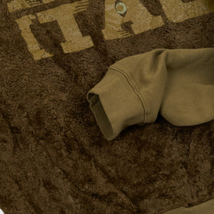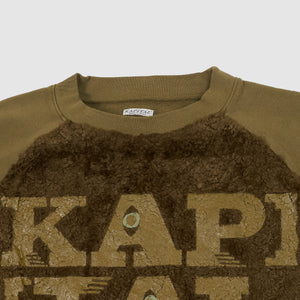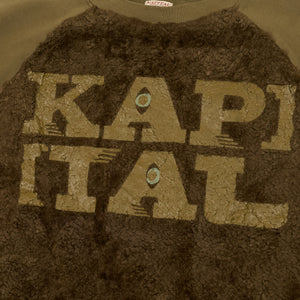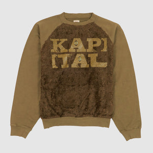 A distinctive blend of playful design and tactile texture, this raglan sweatshirt features a bold front panel of soft faux fur adorned with an eye motif and printed bracket logo. Crafted from comfortable cotton with a relaxed raglan sleeve construction, it embodies Kapital's unique approach to streetwear.