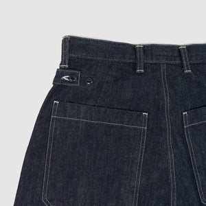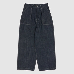Crafted from robust 14oz cotton denim, these relaxed-fit pants draw inspiration from vintage military fatigue designs, reinterpreted through Kapital's distinctive artisanal lens. Featuring functional waist adjusters, a secure zipper closure, and ample double front and back pockets, they blend utilitarian durability with the brand's signature loose, comfortable silhouette.