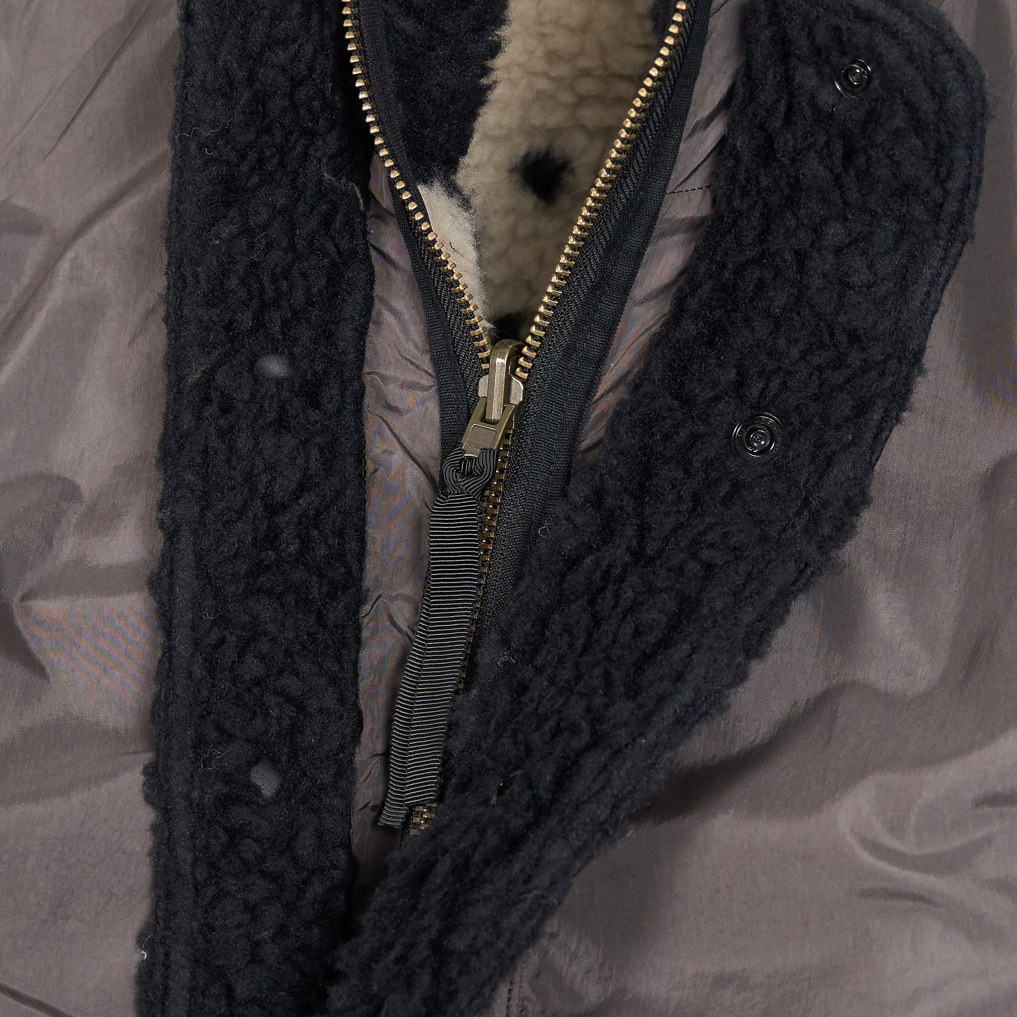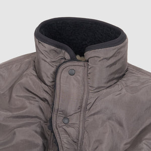 A versatile layering piece built for changing seasons, this reversible jacket from KAPITAL offers two distinct looks in one garment. On one side, a cozy high-pile fleece features an embroidered skeleton motif in black and cream tones. Reverse it to reveal a sleek, weather-resistant nylon shell in dark brown. With zip and snap fastenings for secure closure, it’s a functional and expressive piece designed to adapt to your style and the forecast.