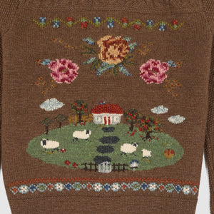 A wearable heirloom, this vintage-inspired cardigan is knit from heathered wool-cashmere yarn and adorned with hand-embroidered floral motifs across the front, back, cuffs, and pockets. The back panel features a pastoral scene—complete with sheep and flowers—rendered in a float-jacquard technique using wool-cotton yarns. Aran stitches, a delicate Pointelle Peter Pan collar, garter-stitch trims, and genuine horn buttons complete this artisanal piece.