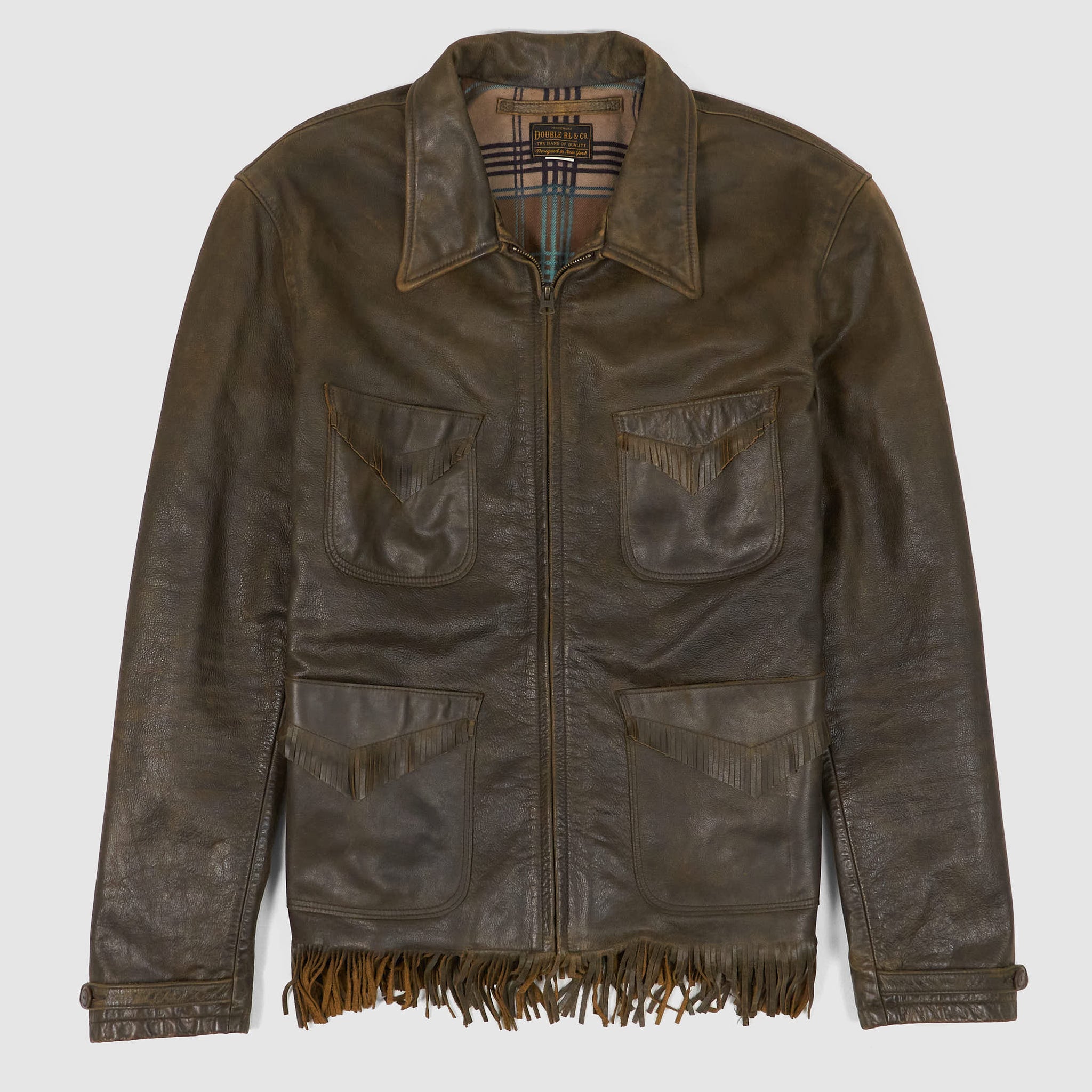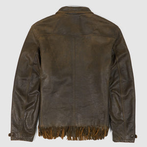 This product is crafted from full-grain cowhide leather and features fringe trim on the pockets and hem. The body is lined with a plaid cotton jacquard fabric, which has been specially developed to evoke a vintage aesthetic.A unique comfortable piece.