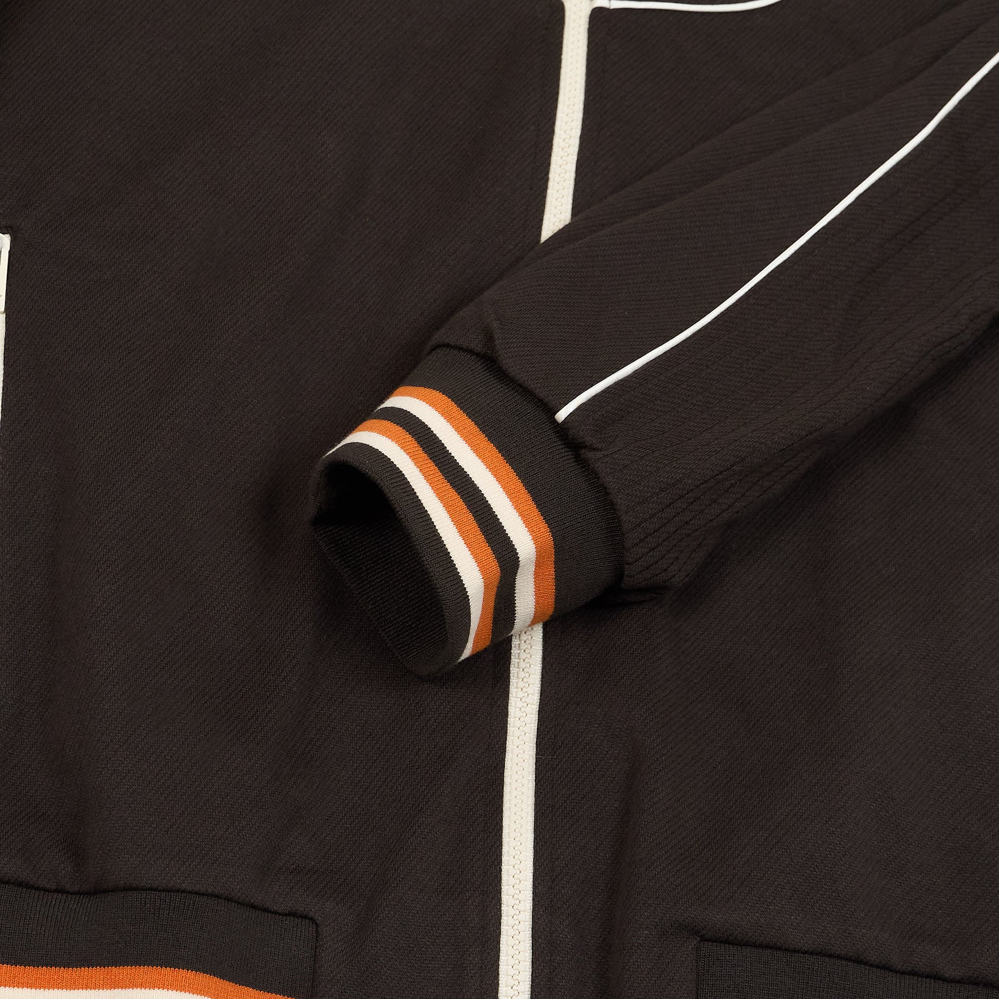 Crafted in Italy with the brand’s signature balance of luxury and effortless style, this jacket features a clean straight cut, a stand collar, and full-zip closure for a sleek, modern look. Functional zippered pockets and striped ribbed cuffs and hem add subtle detail, while the smooth lining and soft handfeel ensure comfort. Finished with a label badge at the hem, it embodies understated elegance with a sporty edge.