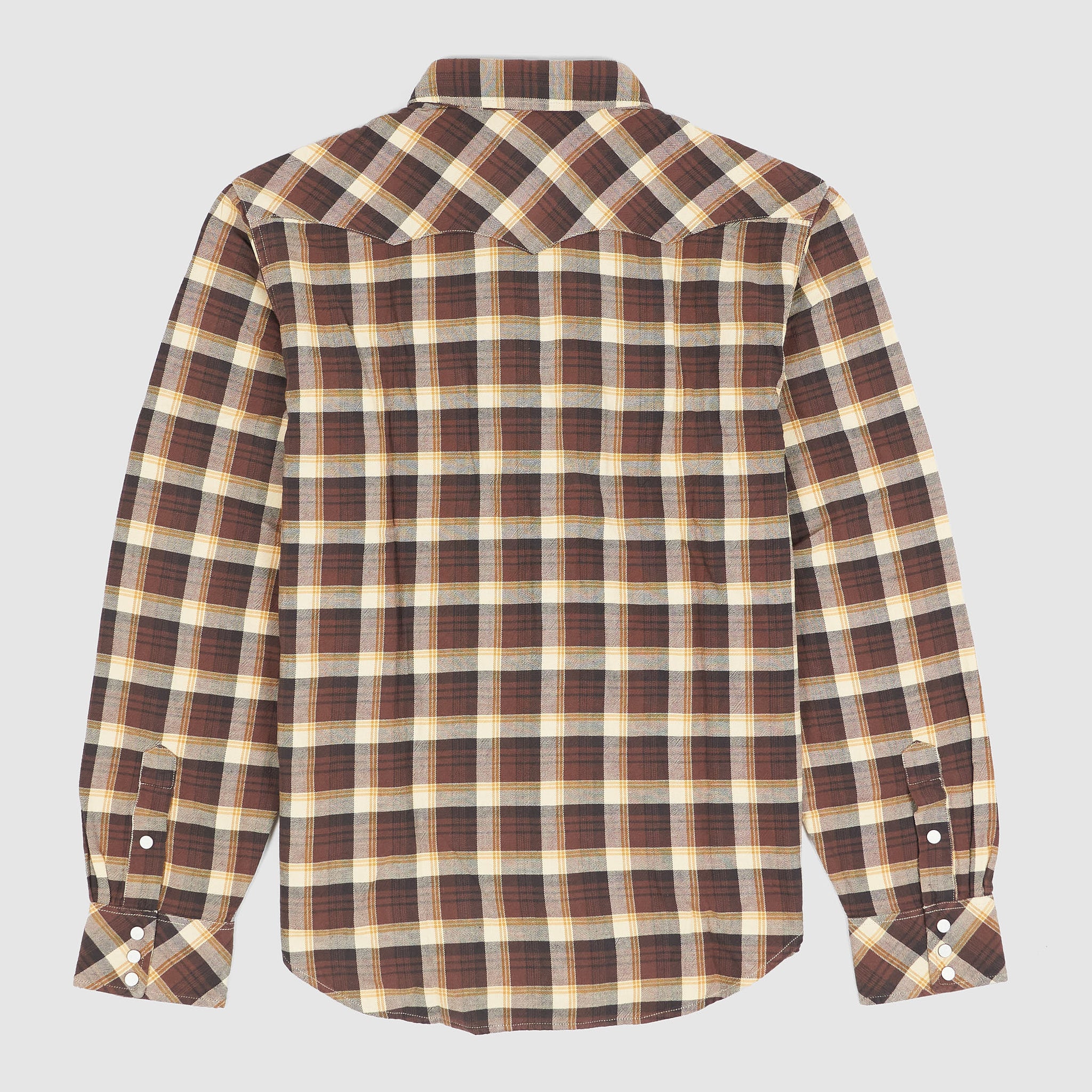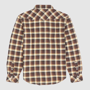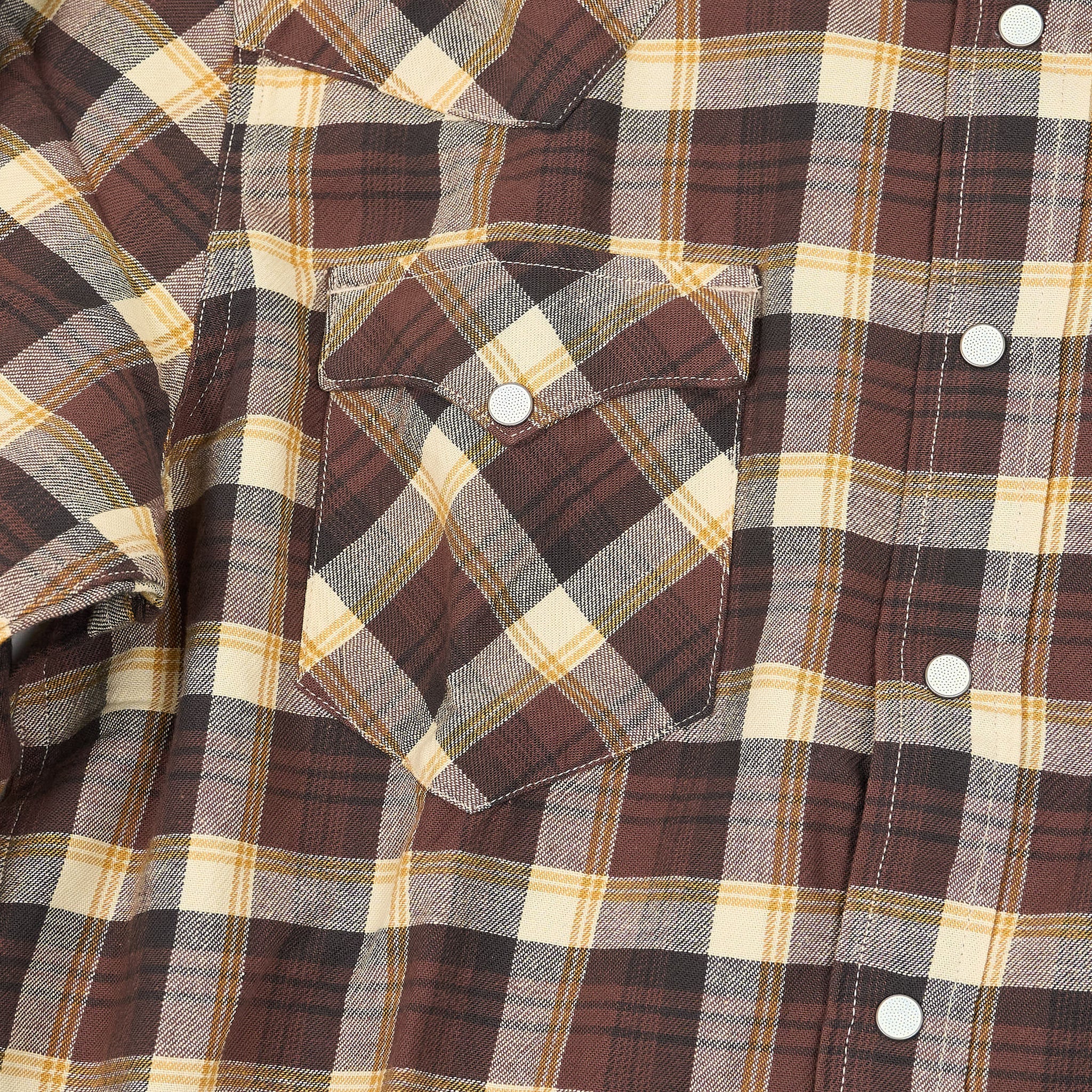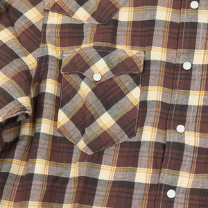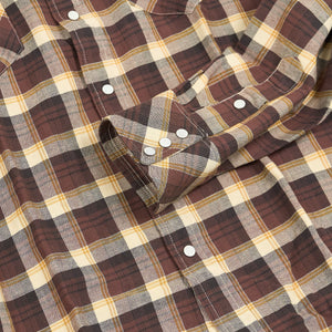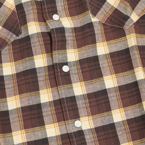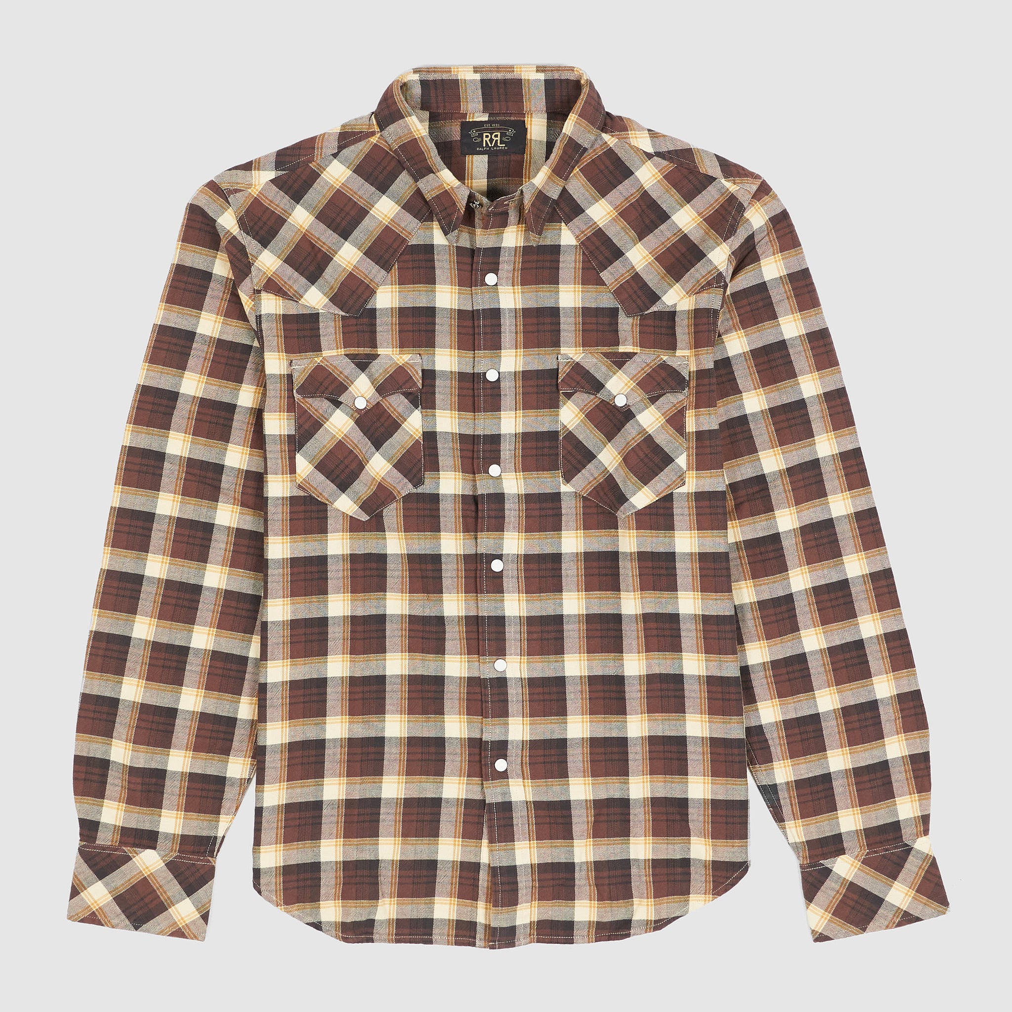 Crafted from yarn-dyed cotton twill in a classic check pattern, this shirt is designed with Double RL's slimmest Western fit for a tailored silhouette that follows the body. It features signature Western details like angled yokes on the front and back, enamel snap buttons with a subtle dot pattern, and a metal collar-tip button. The snap-button placket, sport cuffs, and two snap-closure chest pockets complete the rugged-yet-refined look.