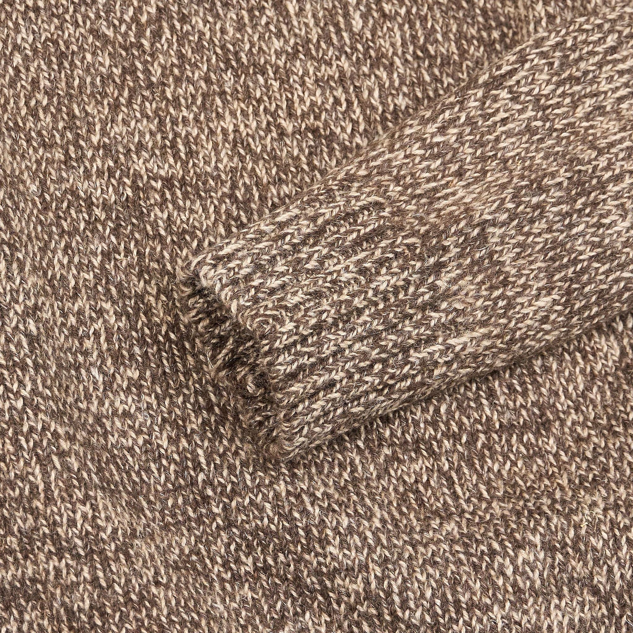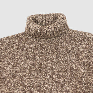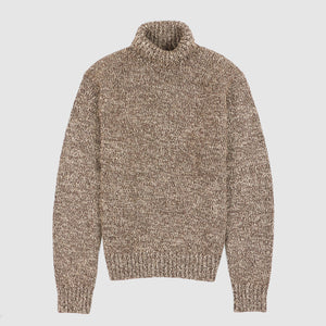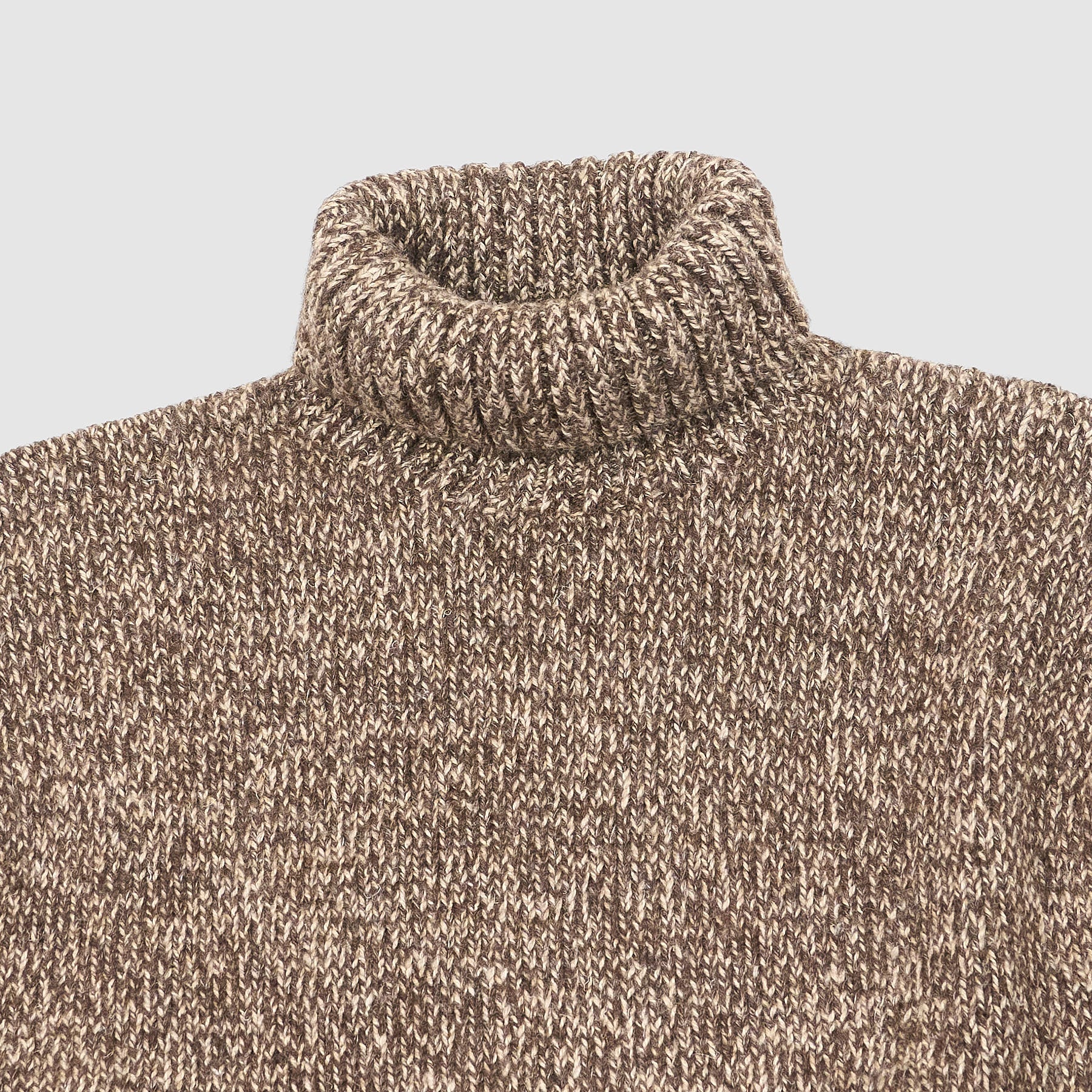 Crafted from a substantial wool-cotton-linen blend using specially singed yarns for a soft, vintage-inspired look, this jersey-knit sweater offers both texture and timeless appeal. The ribbed roll neck, cuffs, and hem provide structure and a comfortable fit, making it an ideal layer for cool weather.