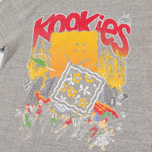 Playful, bold, and unmistakably Kapital, this cotton-jersey tee stars the brand’s double-eyed “Buster Peckish Bowy” character in a Godzilla-inspired role. Screen-printed with “Kookies” across the front and sleeves, it blends retro monster-movie nostalgia with the brand’s signature quirky aesthetic.