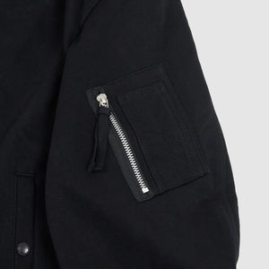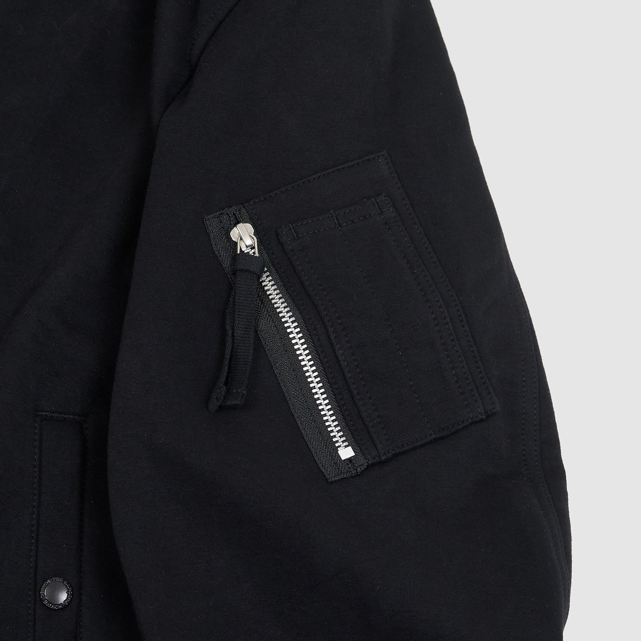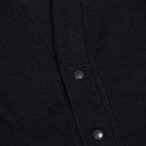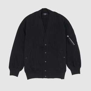 A hybrid piece blending the relaxed comfort of a cardigan with utilitarian bomber jacket details, this jersey knit features a five-button closure, a functional zippered pocket on the sleeve, and buttoned side pockets for modern versatility. Soft, lightweight, and designed for layered wear, it bridges casual and tactical aesthetics with ease.
