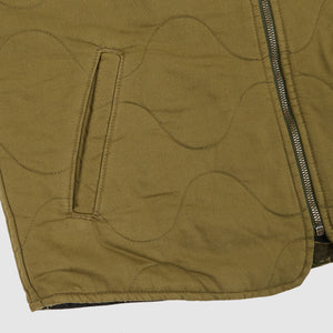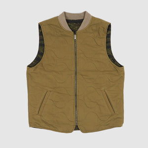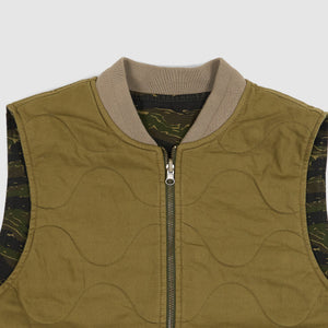 A versatile and thoughtfully crafted reversible vest, featuring a rugged tiger stripe camo on one side and a subtly dusty green on the other. Lightweight yet substantial, it’s designed for layering and adaptable styling, with a fit that runs slightly small compared to standard American sizing.