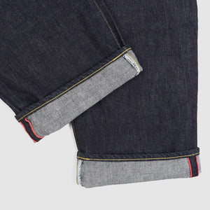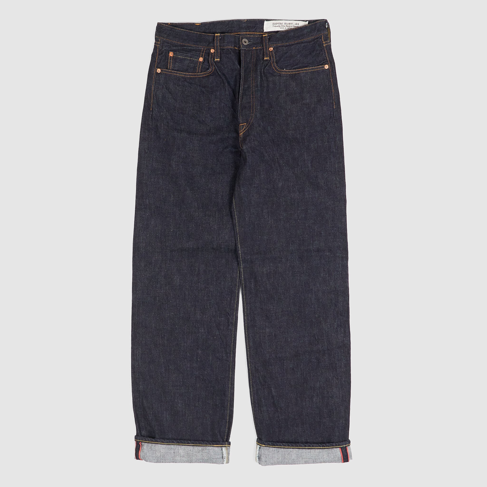Handcrafted in Kojima, Japan—the heart of Japanese denim—these jeans are cut from 14oz. mid-weight cotton for a classic, structured feel. Featuring a regular-straight leg and a distinctive low-crotch silhouette, they offer a unique take on traditional workwear styling. The five-pocket design is accented with camel-tone stitching along the placket and pockets, while burnished buttons and rivets provide a subtly worn-in character from the first wear.