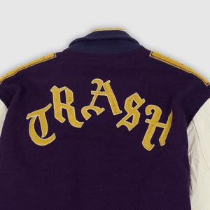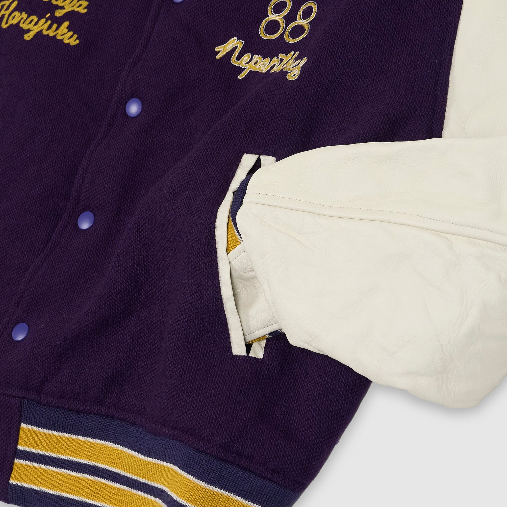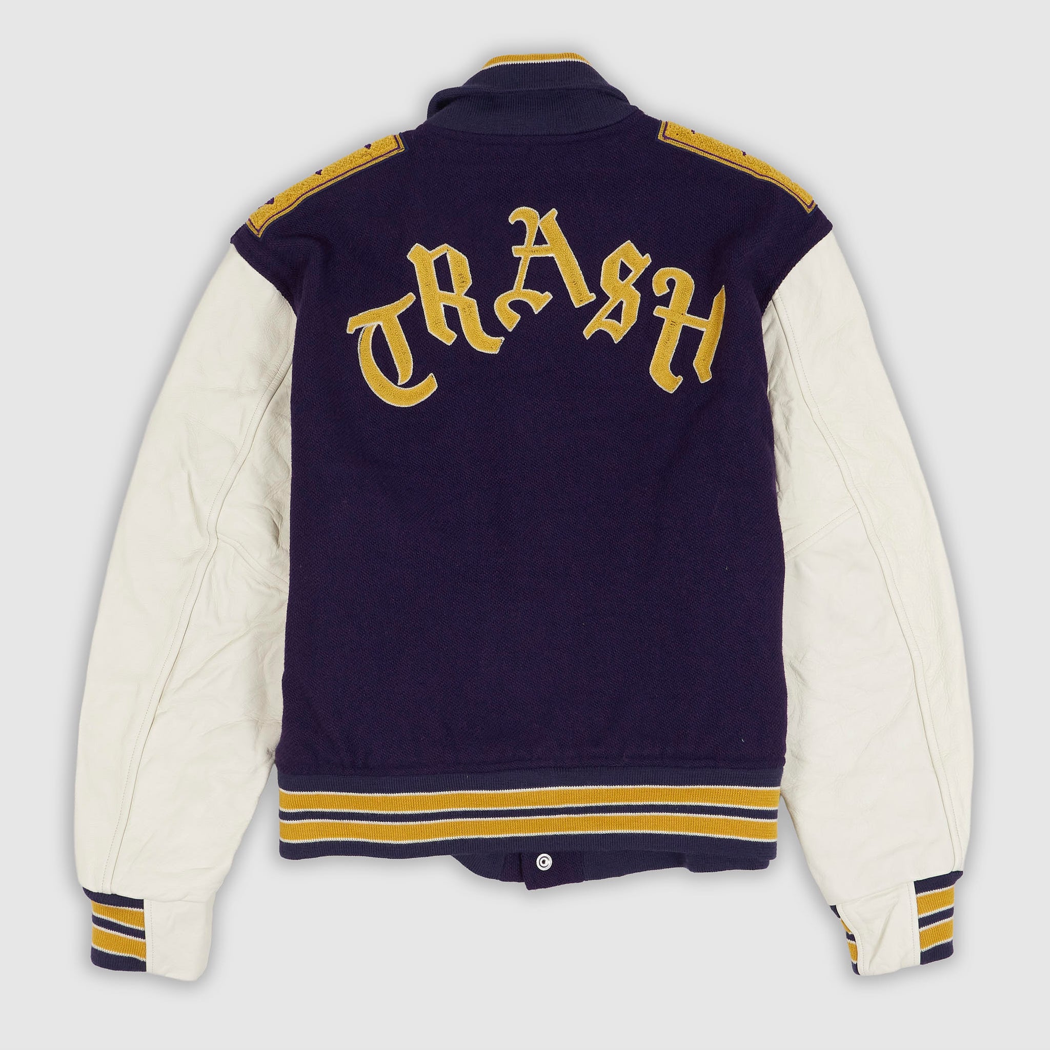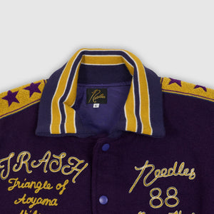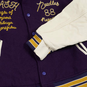 A standout piece from the Fall/Winter 2025 collection, this wool varsity jacket commemorates the 1988 founding of Nepenthes with original Needles embroidery. Featuring a rich purple wool body contrasted with white sleeves and vibrant yellow and navy trim, it showcases the "TRASH" insignia—representing the Triangle of Aoyama, Shibuya, and Harajuku—honoring the brand's Tokyo roots.