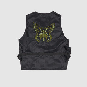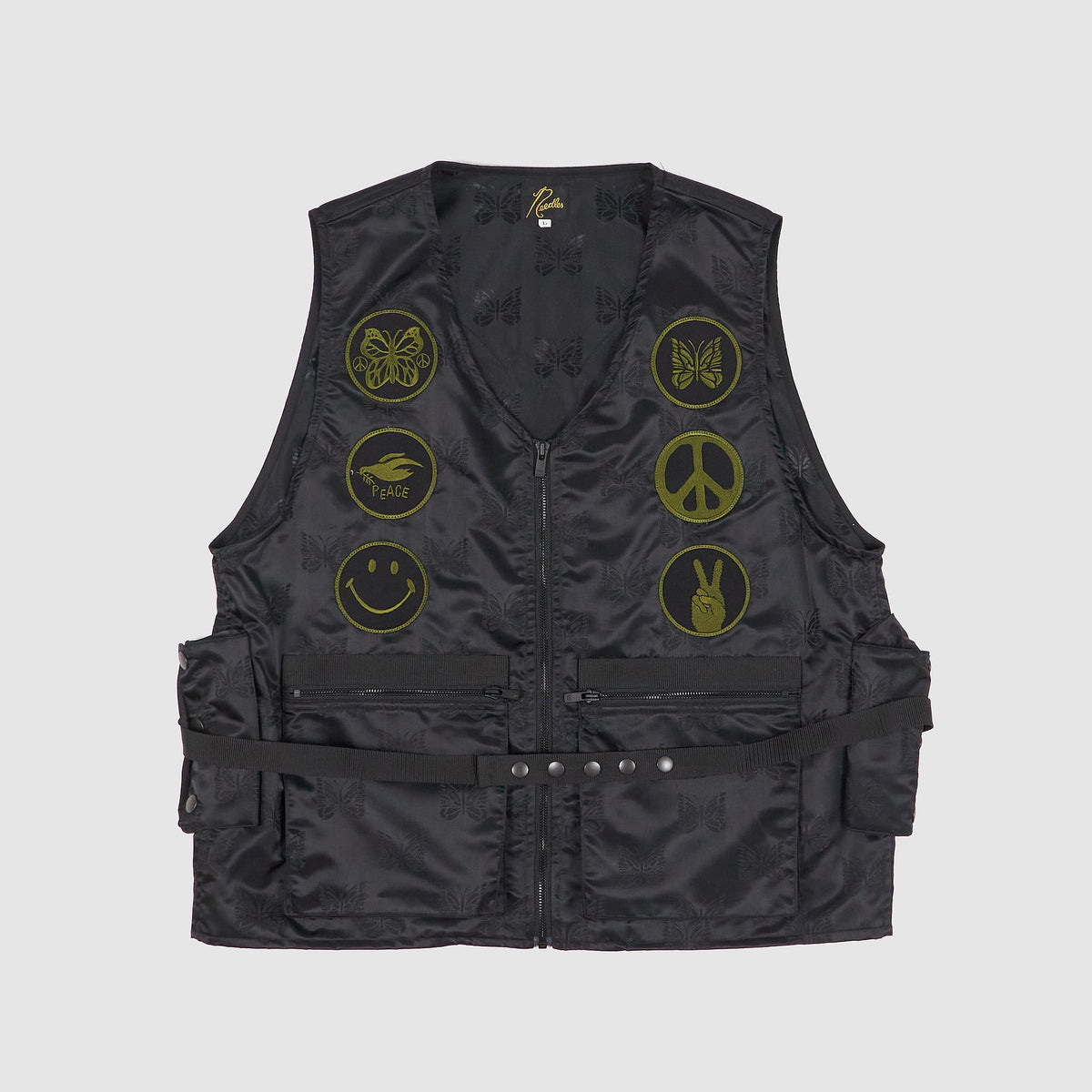 A radical reimagining of Vietnam War-era signal corps gear, this vest transforms utilitarian radio operator design into luxurious streetwear. The original military blueprint remains intact—complete with underarm radio pockets and an adjustable extension belt—but reinterpreted in NEEDLES’ signature maximalist style with exotic python jacquard fabric and artful patch detailing.
