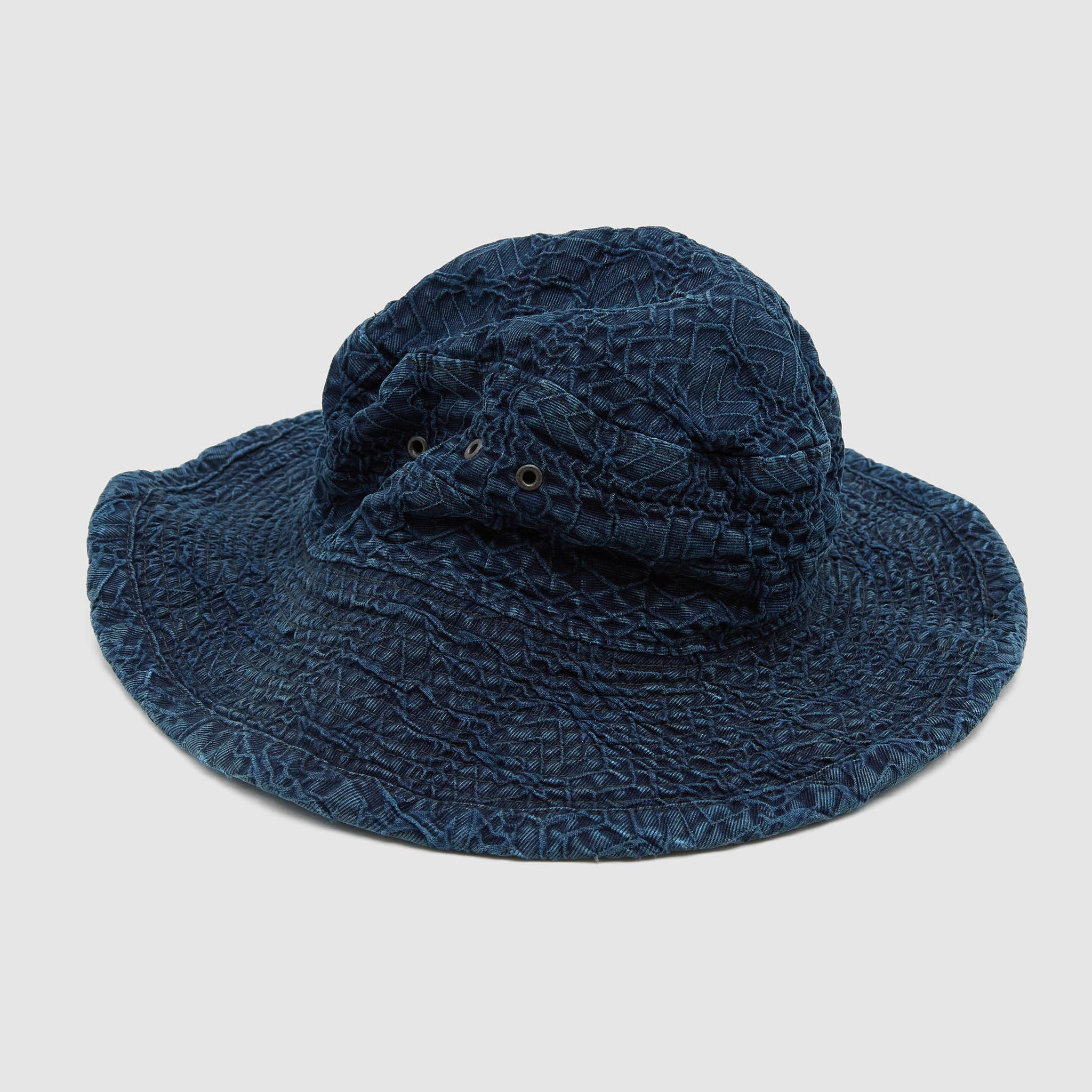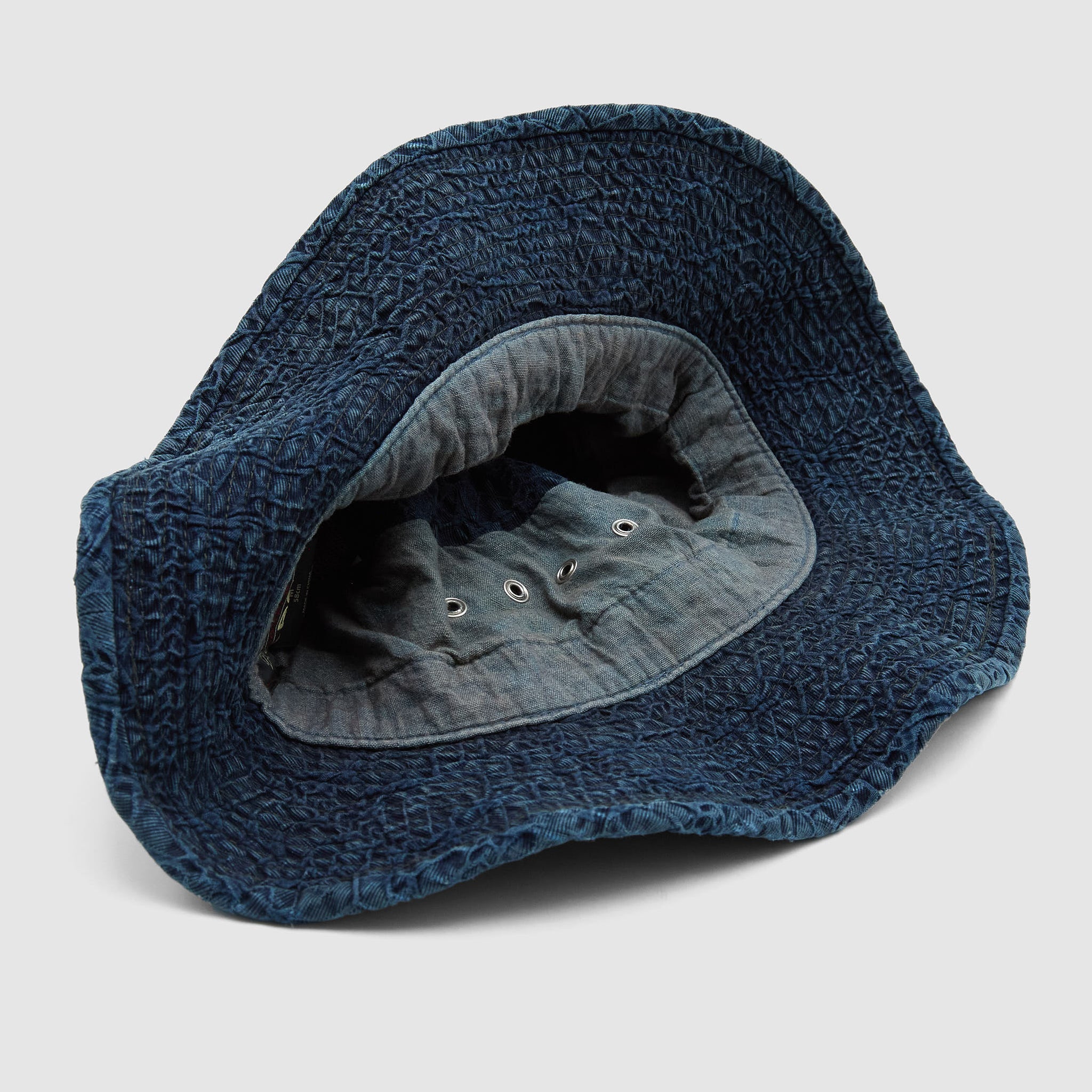 A masterclass in heritage craftsmanship, this bucket hat is woven from yarn-dyed cotton jacquard in true indigo—the crown detailed with a self-fabric band and ventilating distressed metal grommets. Lined with Japanese chambray for breathability, it merges workwear utility with artisanal dyeing traditions.