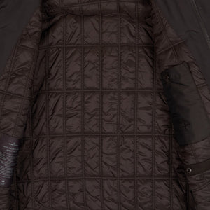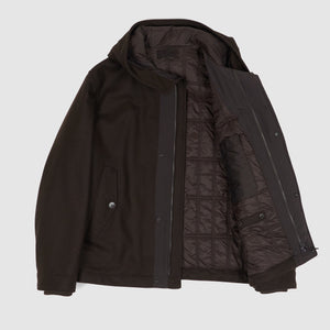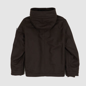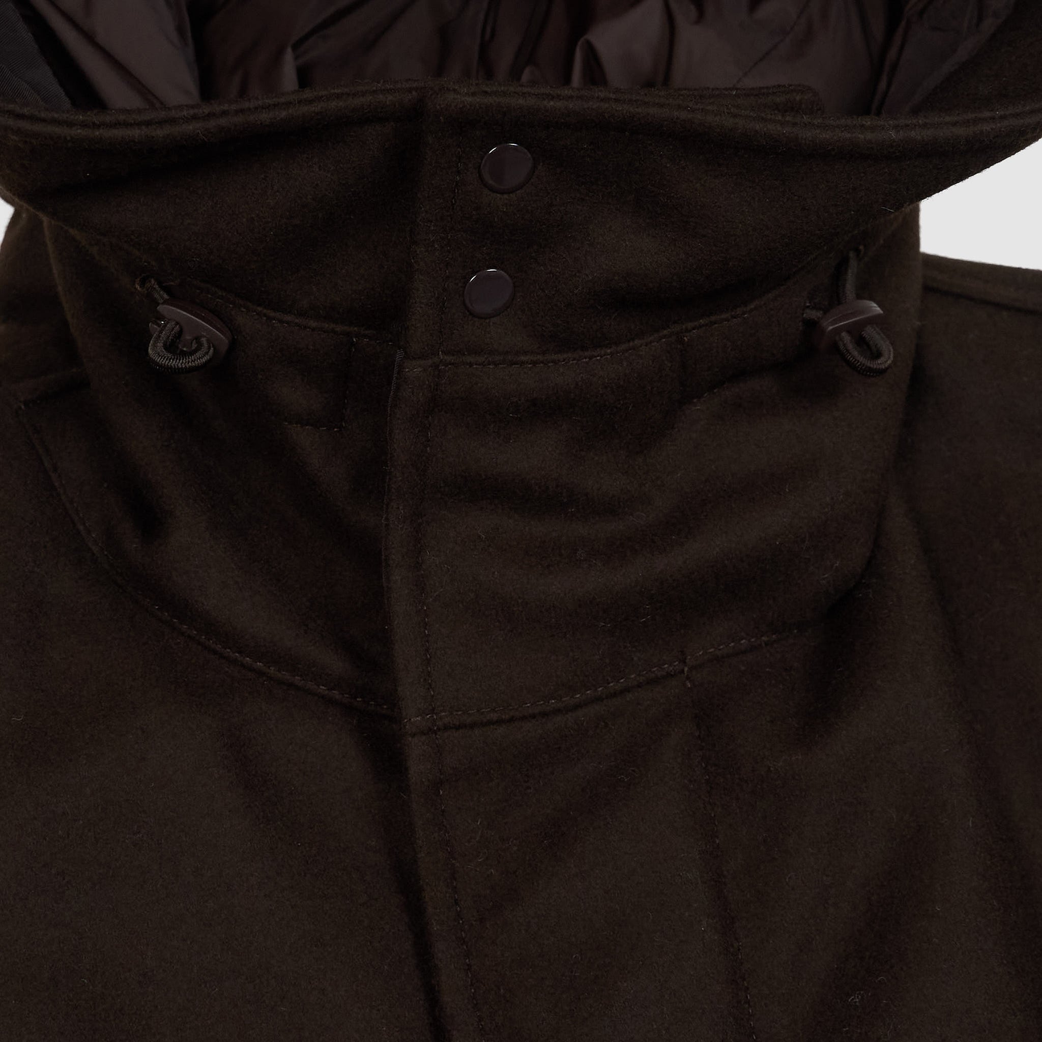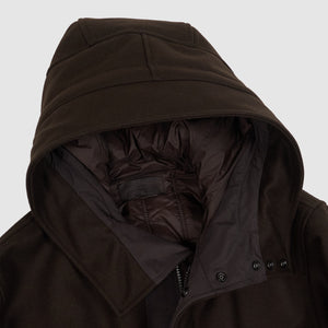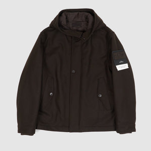 A masterclass in understated technical design, this hooded jacket is crafted from a refined wool-nylon flannel blend with a soft brushed nap, insulated with recycled PrimaLoft® Silver for lightweight warmth. As part of the Ghost collection, it features full monochromatic styling—including a tonal badge—and is finished with a PFC-free anti-drop treatment for weather resistance. The clean silhouette includes a concealed two-way zip, adjustable hood, and double front pockets, blending urban utility with minimalist elegance.