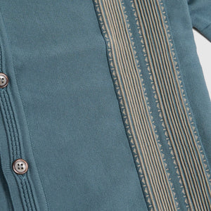 A knitted polo shirt with an aloha shirt design. The pleated pattern on the front is expressed entirely in knit, offering a unique textural take on a classic summer silhouette. Tailored with a retro color scheme, it has a boxy, relaxed fit for easy, everyday wear.