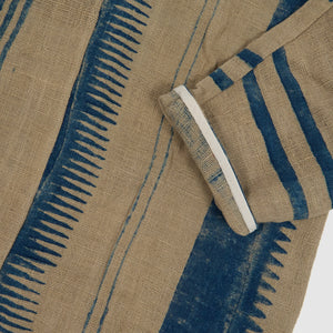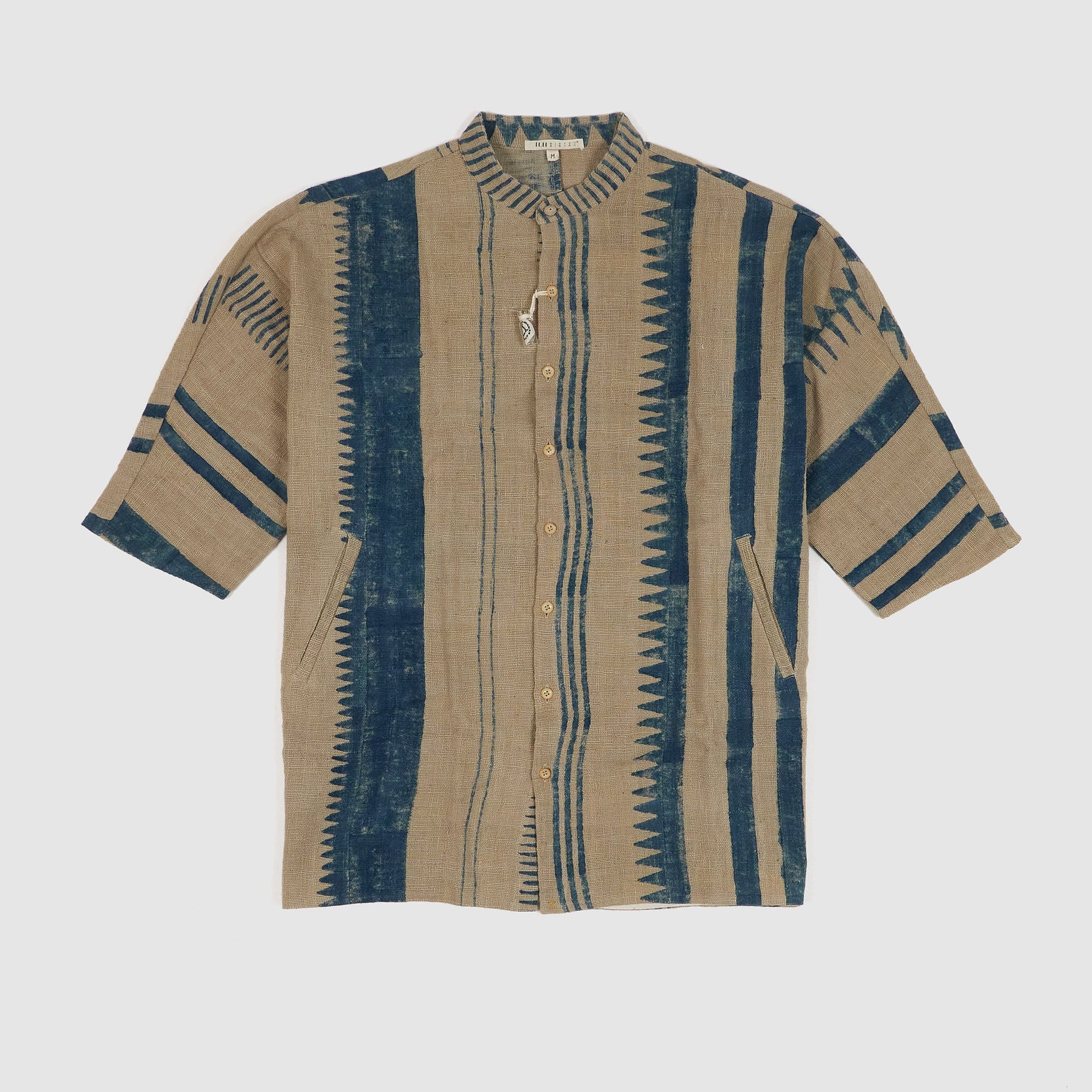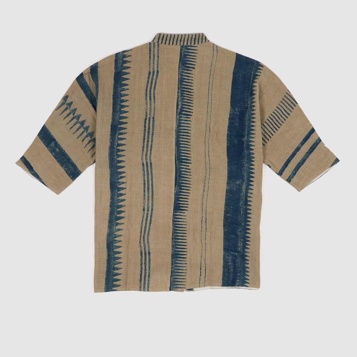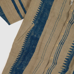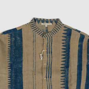 A harmonious blend of structure and fluidity, this shirt pairs crisp band collar tailoring with the graceful drape of kimono-inspired sleeves. Crafted from a luminous cotton-silk blend, its surface comes alive with intricate motifs—each one carefully pressed by hand using traditional block printing techniques. The interplay of textures creates depth: cotton's grounded crispness against silk's whispering movement.