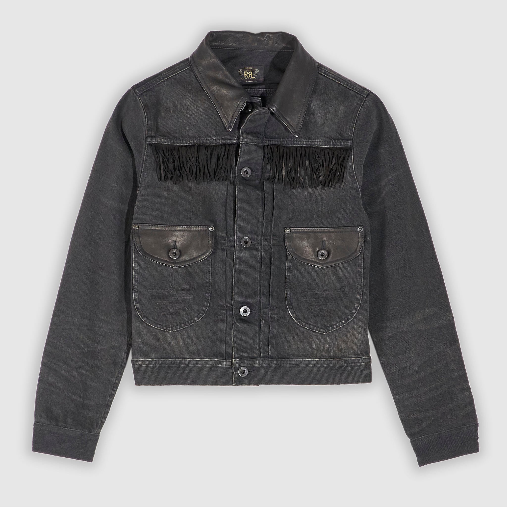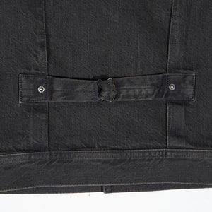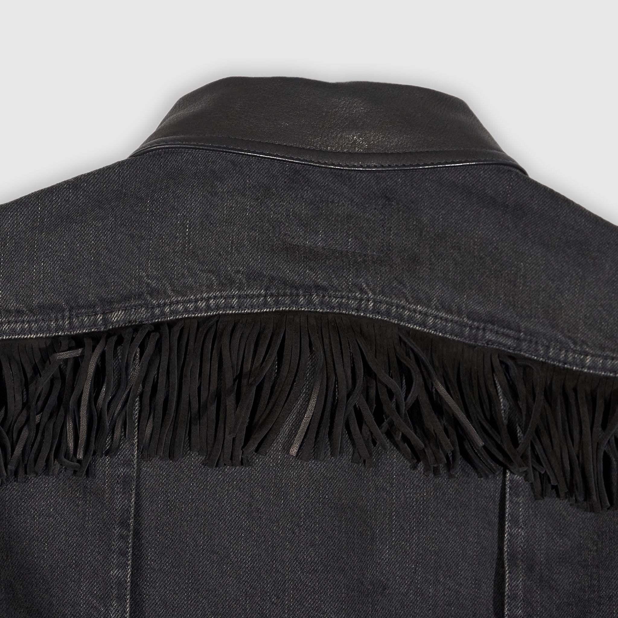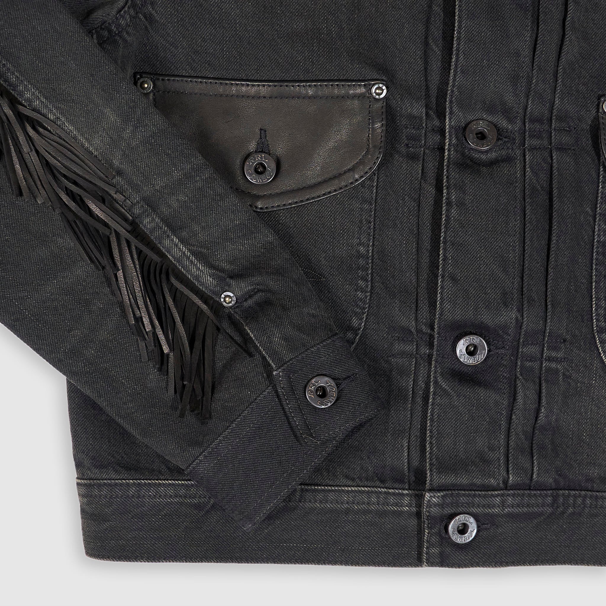 This vintage-inspired jacket is made from black denim. Right-hand twill is heavily tinted and abraded for a distinct worn-in look. The suede collar and fringe trim are the defining features of this piece. The pockets feature classic Western-style decorative stitching. The adjustable buckled back is a key feature. Unlined. Sanforized® to minimise shrinkage. These buttons are made in America.
