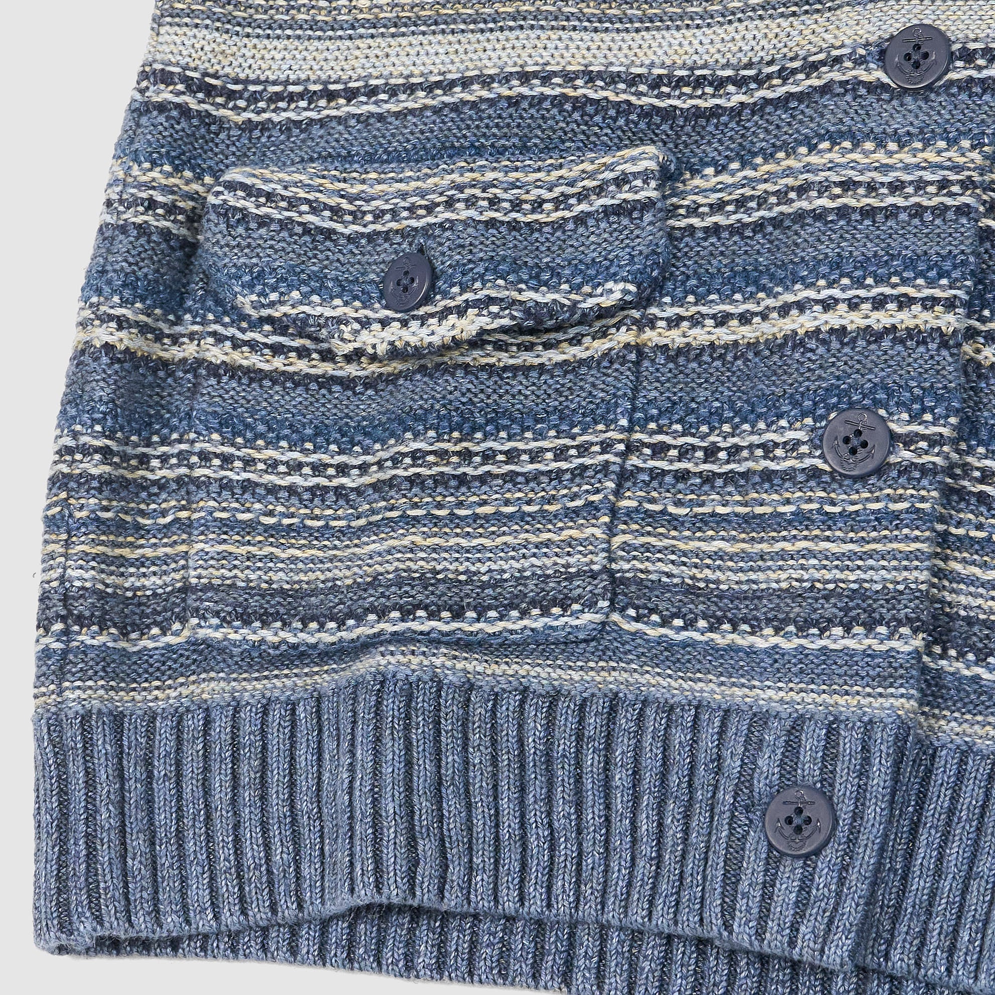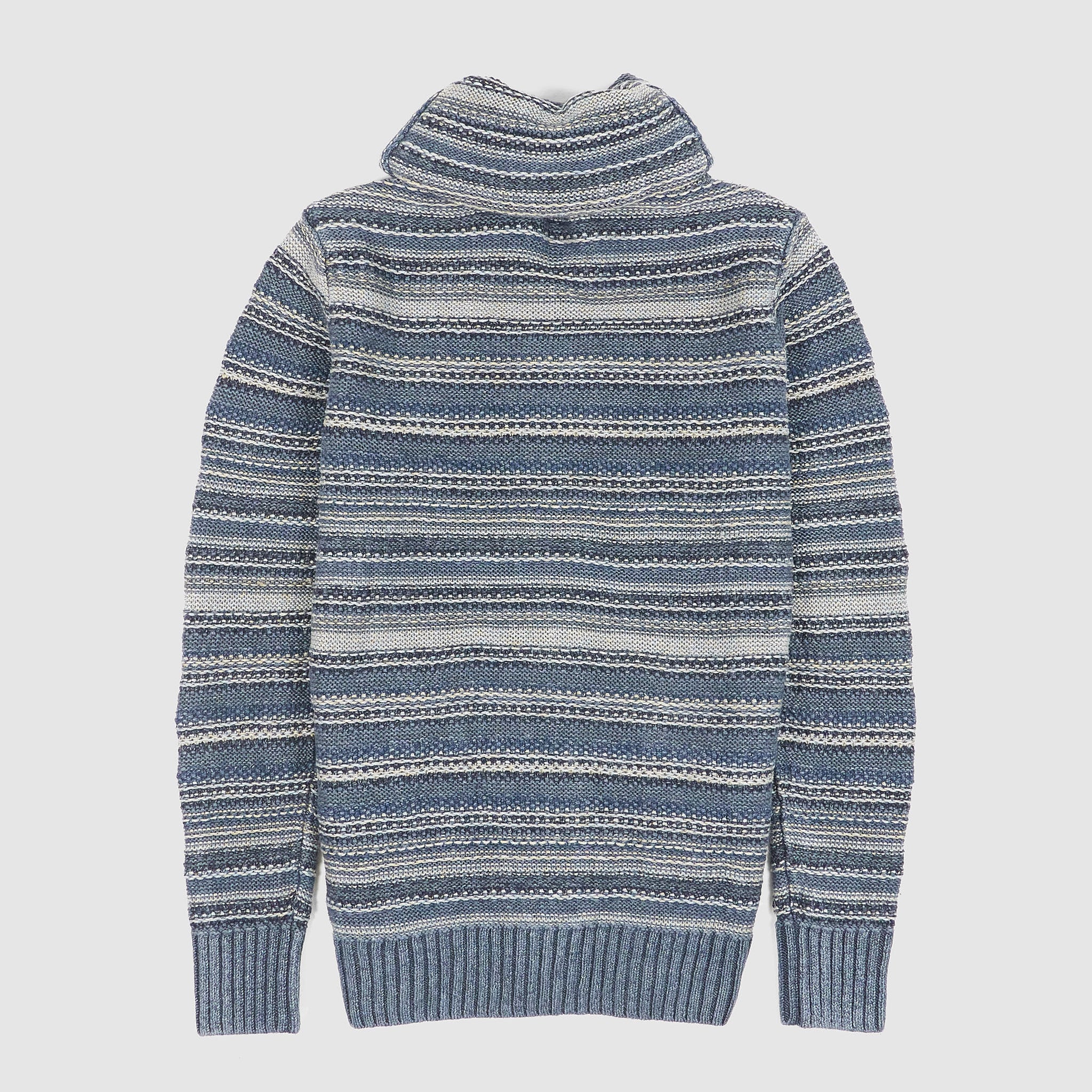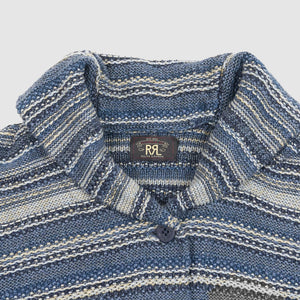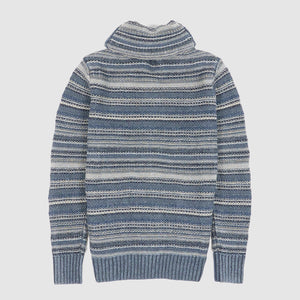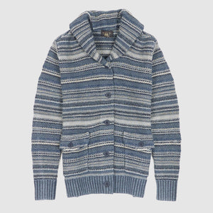 Crafted from indigo-dyed linen and cotton yarns, this textured cardigan features a striped pattern inspired by vintage fabrics and intricate, original knit stitches throughout. The double-layered shawl collar and button placket offer structure and depth, while the ribbed trims and pre-washed finish ensure a relaxed, lived-in feel from the first wear.