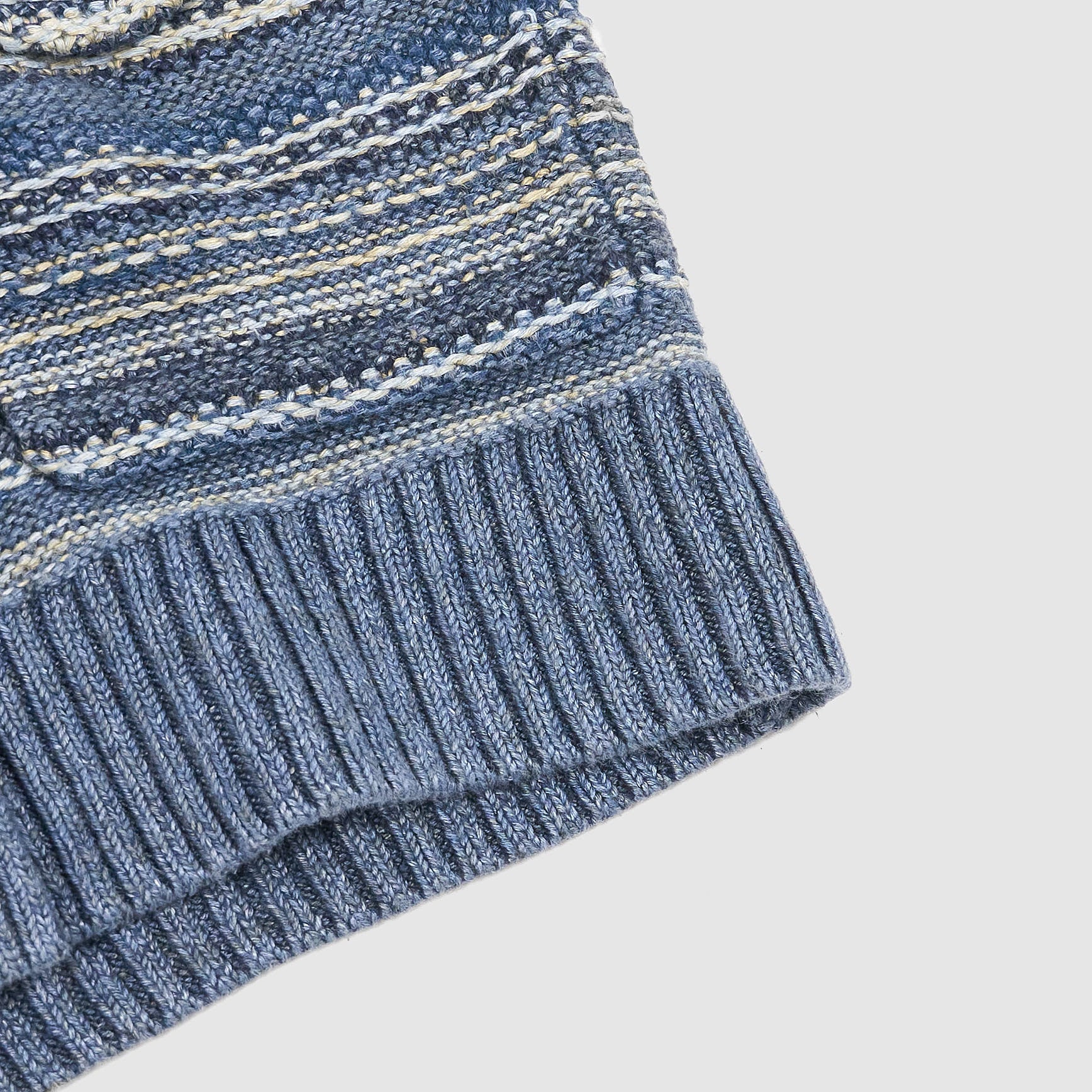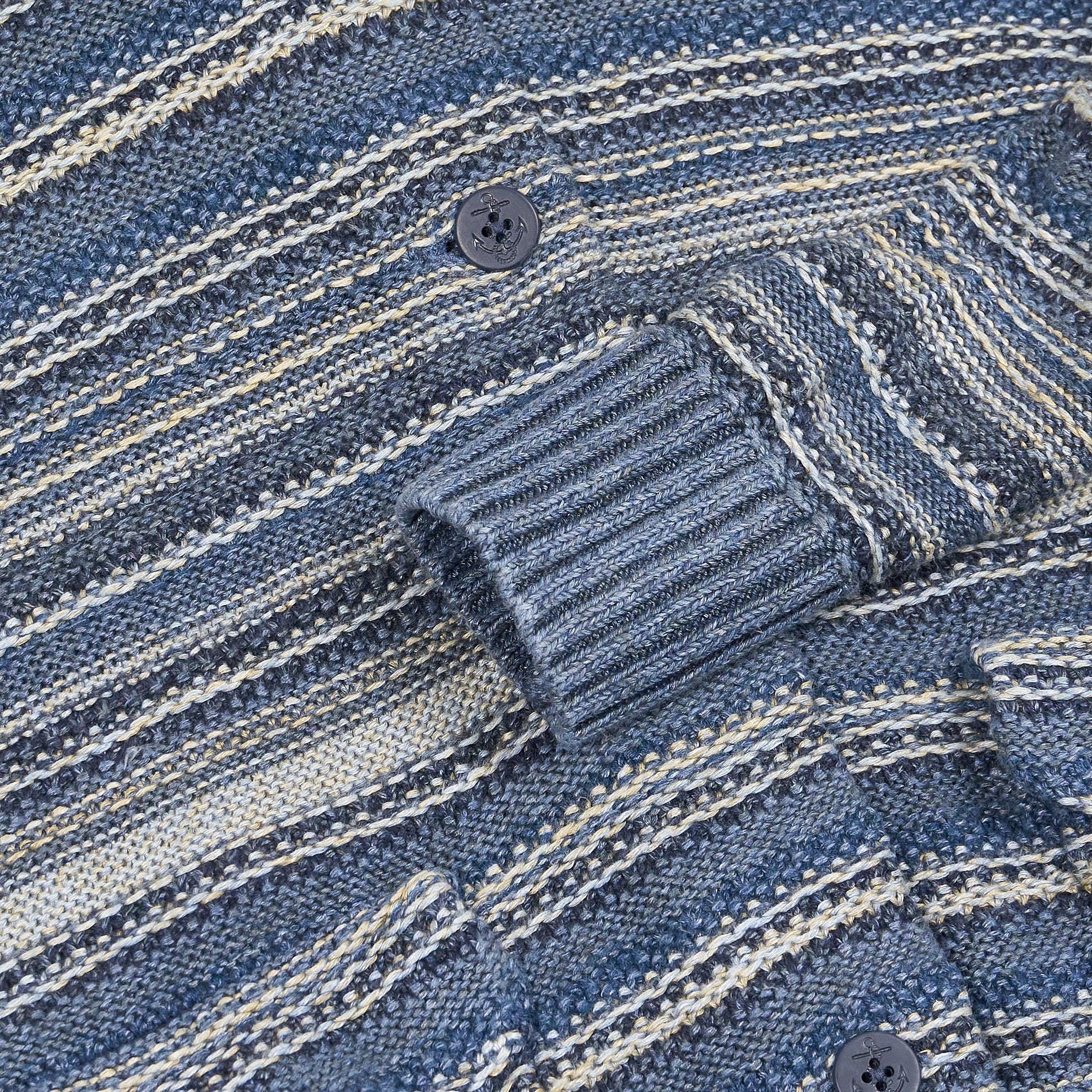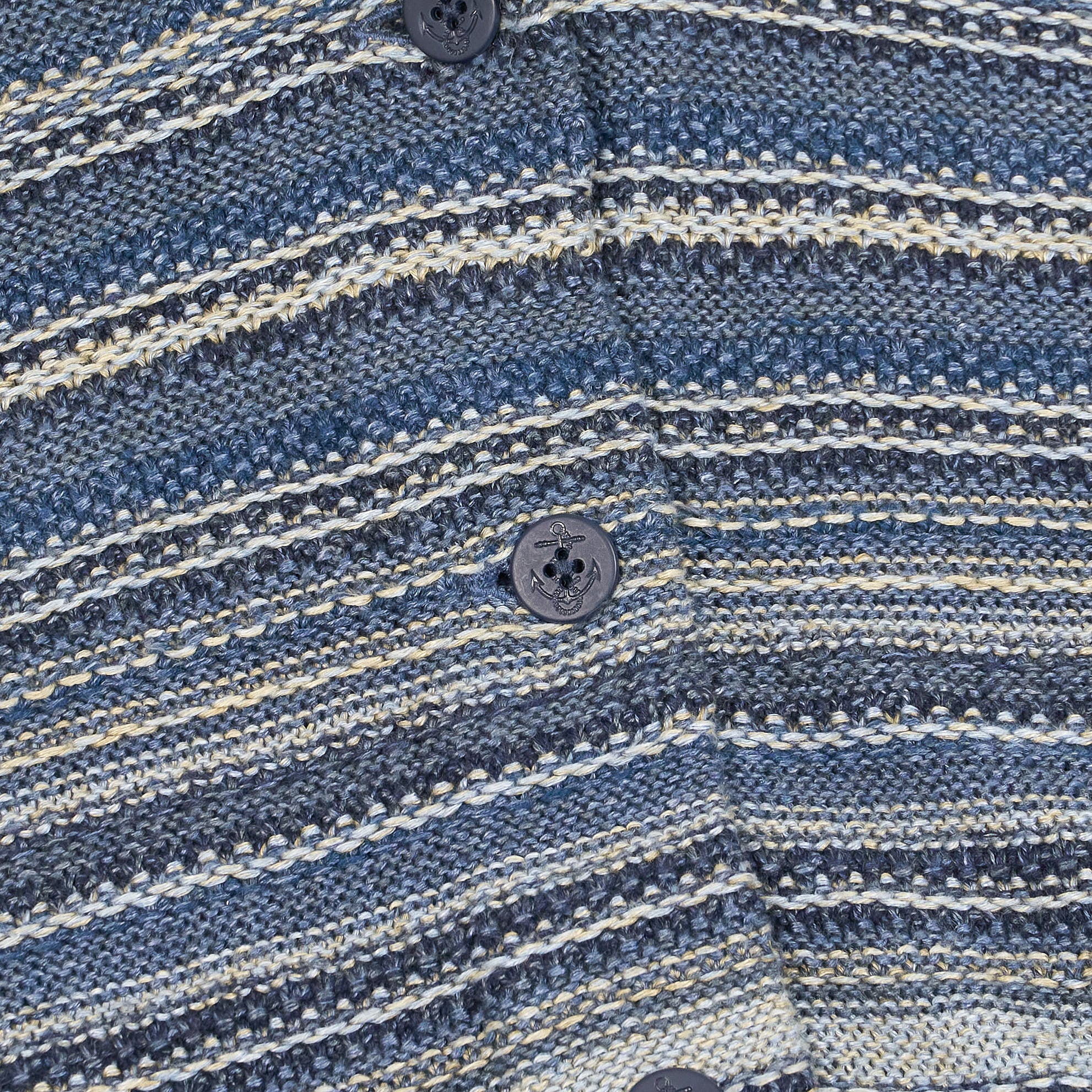 Crafted from indigo-dyed linen and cotton yarns, this textured cardigan features a striped pattern inspired by vintage fabrics and intricate, original knit stitches throughout. The double-layered shawl collar and button placket offer structure and depth, while the ribbed trims and pre-washed finish ensure a relaxed, lived-in feel from the first wear.