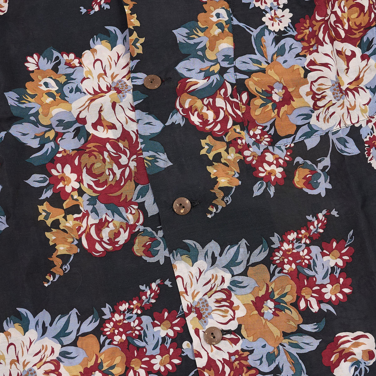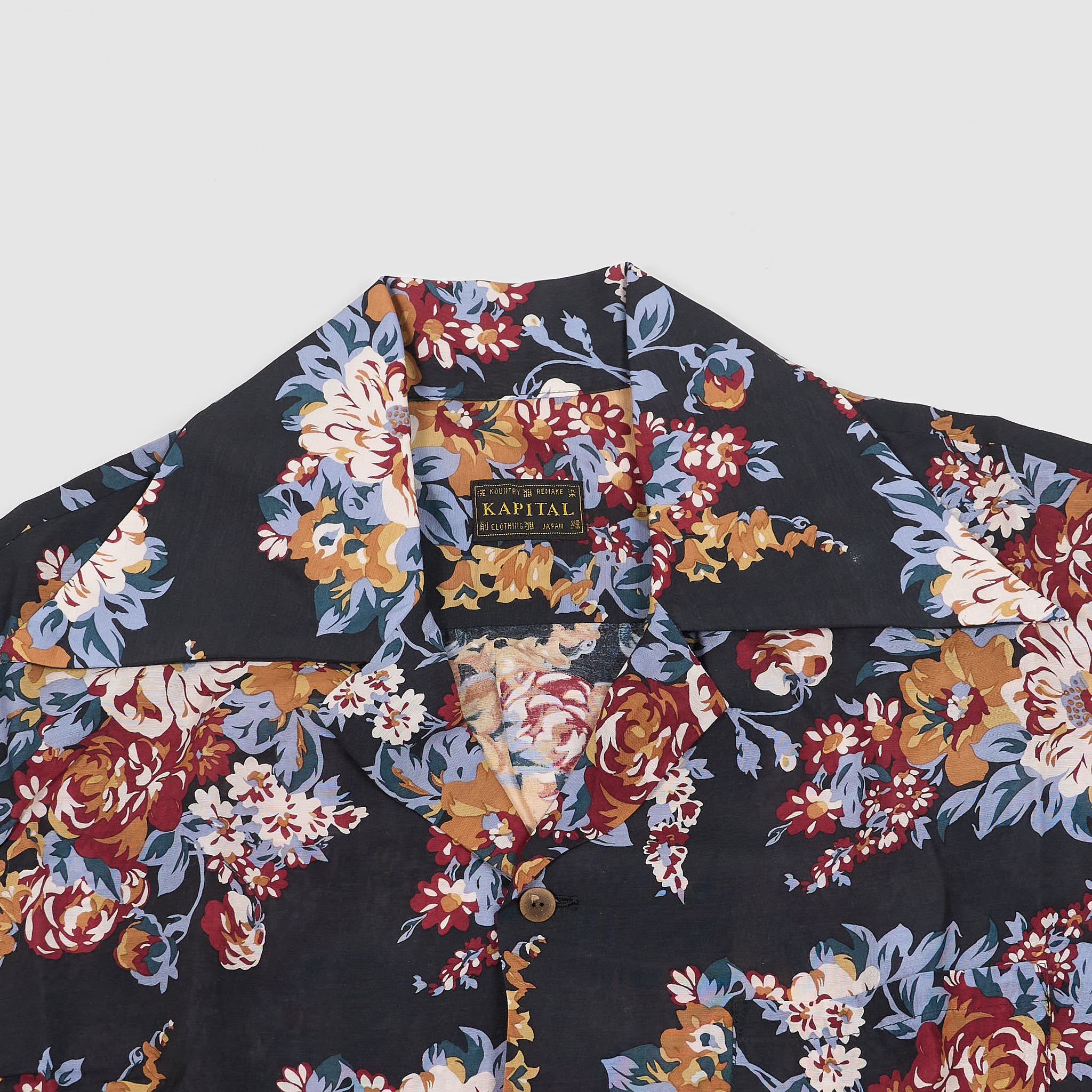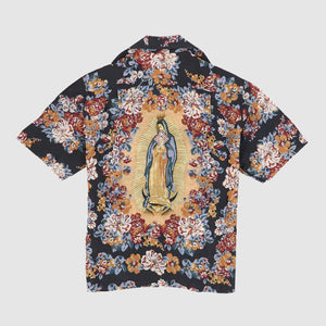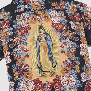 A bold fusion of sacred imagery and tropical ease, this standout piece redefines the aloha shirt with Kapital's signature irreverent artistry. The lightweight cupro/silk blend drapes like a second skin, adorned with vibrant florals that frame the dramatic Virgin Mary backpiece—a striking contrast against the shirt's exaggerated Cuban collar and relaxed silhouette.