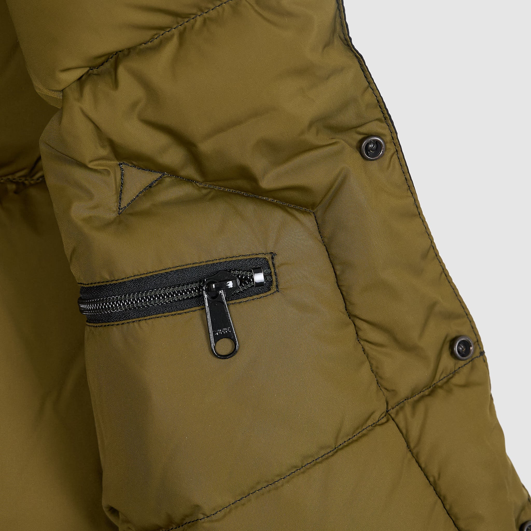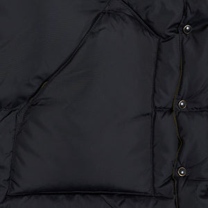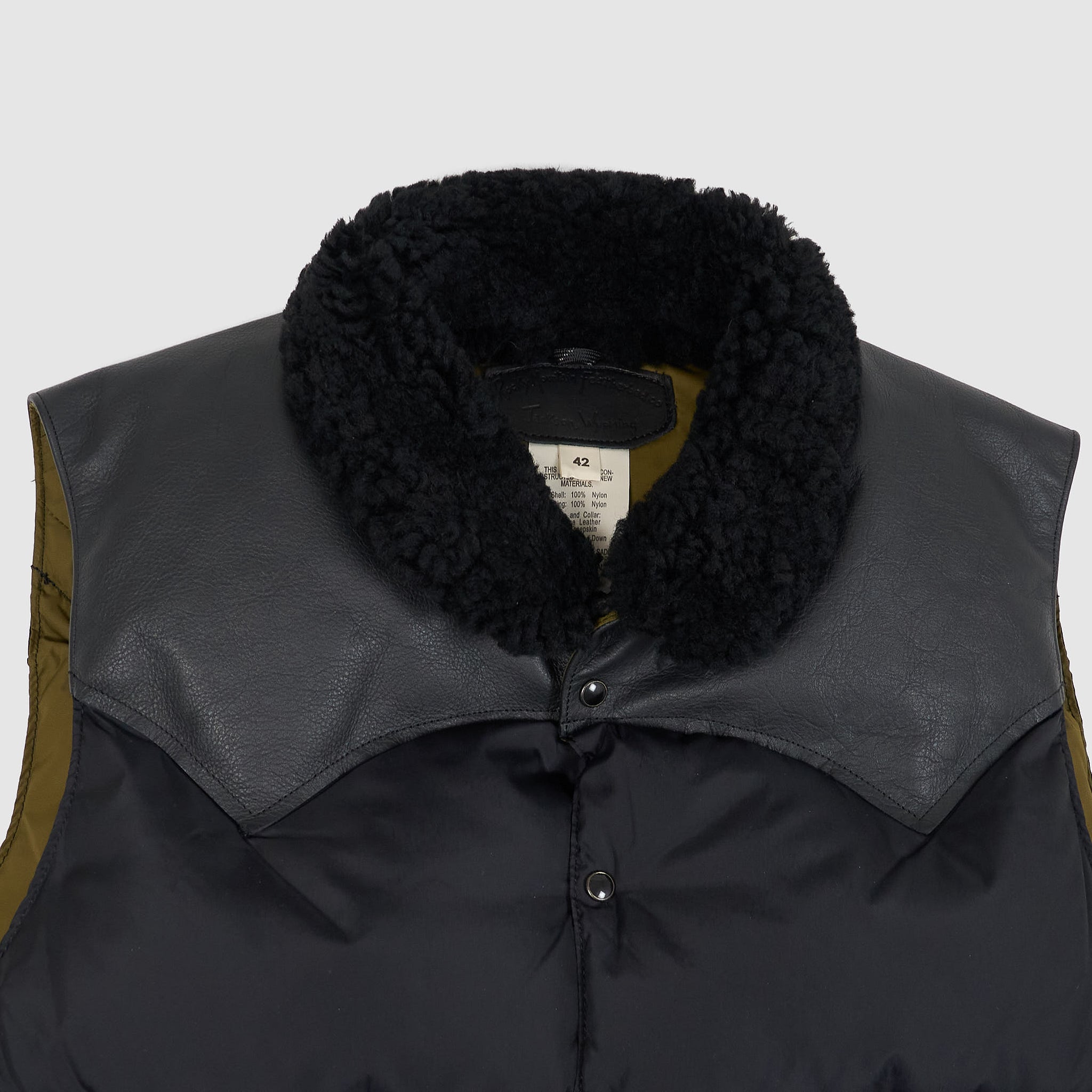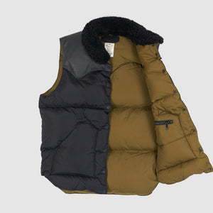 Rocky Mountain Featherbed famous down vest made of 70 denier nylon taffeta. A durable and long-lasting material. Also, the construction is made in a 3-layer construction that improves its lightness and warmth retention. The European down is water-resistant treated to make it long-lasting. Yokes made of natural and chrome tanned leather with a shearling collar. Two hand warmer pockets with separate Velcro hidden pockets and press-stud front closure. One inside pocket with zipper.