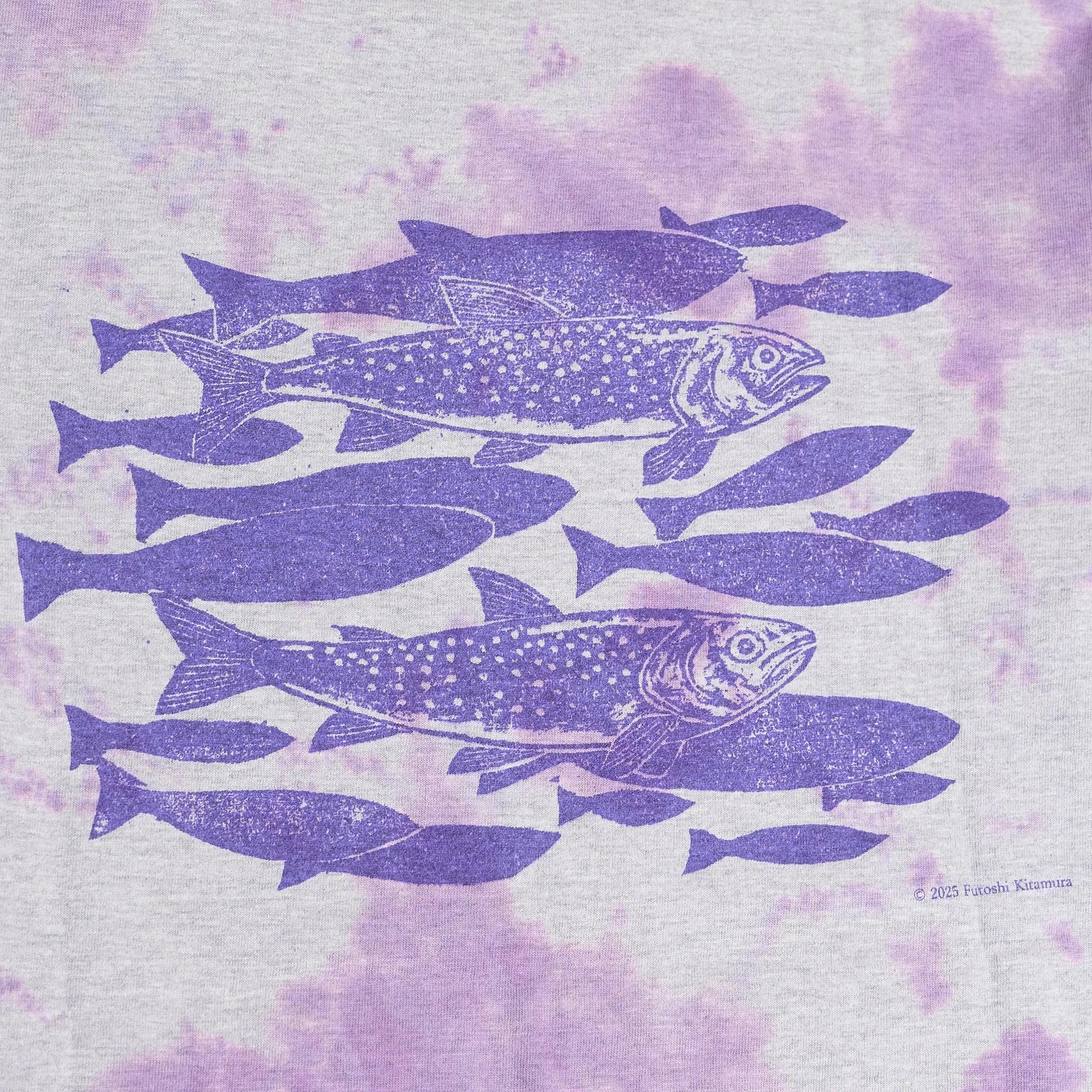 A collaboration between Hokkaido printmaker Futoshi Kitamura and South2 West8. The print art—featuring subjects such as flora, fauna, and trout—is expressed in print, creating a humorous and detailed worldview. This shirt features trout on the back and a reinterpretation of the South2 West8 logo on the front, also composed of trout. The original logo is reimagined from Kitamura's distinctive perspective.